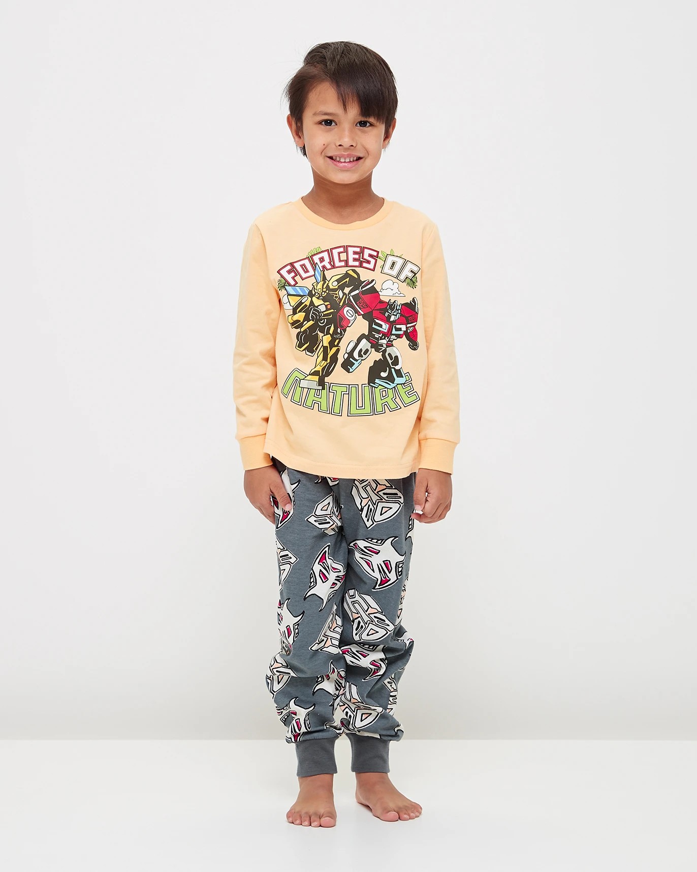 Send him to bed in style with the Transformers Cotton Pyjama Set! This cozy sleep set is made from a Cotton fabric, ensuring kids stay comfortable all night long. It features a regular fit orange long sleeve top with a ribbed crew neck, long sleeves with ribbed cuffs and a large Transformers print to the chest. The matching charcoal grey all over print pants have an elastic waistband and ribbed cuffs for added comfort. Perfect for young fans of the robots in disguise!