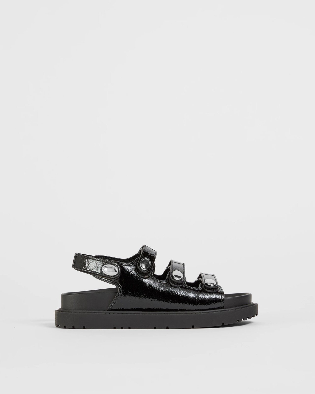 Triple Strap Footbed Sandal - Katty - Black crinkle