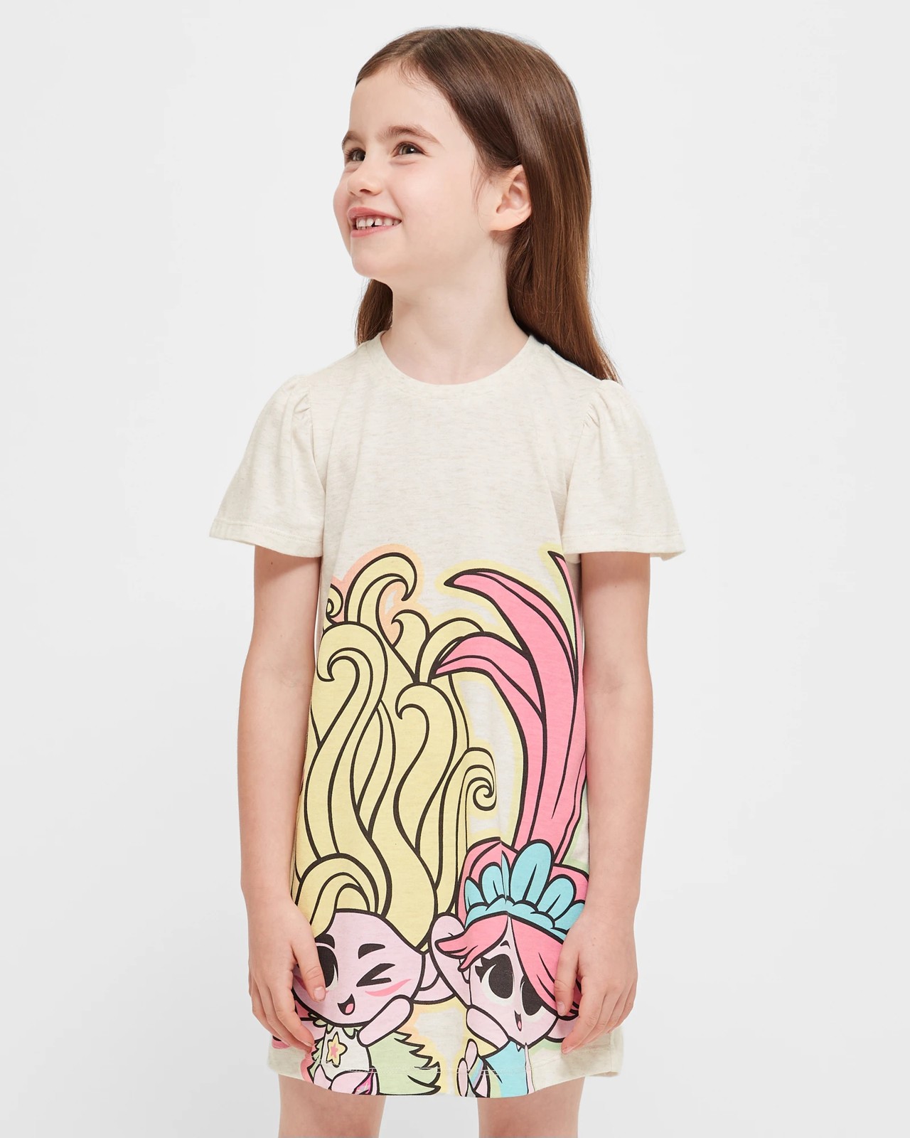 This oatmeal Trolls Sleep Nightie is the perfect addition to any girl's wardrobe. Crafted from a soft polyester and cotton blend, this regular fit nightie features a ribbed crew neckline and short sleeves with gathered shoulders. An eye-catching large Trolls print adorns the front for added fun, while the straight hem completes the look. Perfect for sleepovers and lazy days alike!