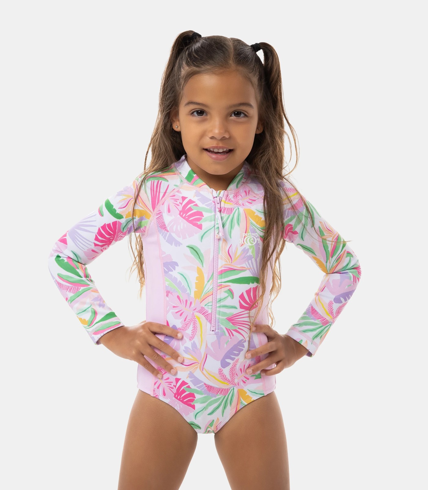 Great for the beach or the pools, comes this Piping Hot floral surfsuit with excellent UPF 50+ sun protection. Includes long sleeves, a front zip through opening and unique double knit fabrication for comfort and warmth.