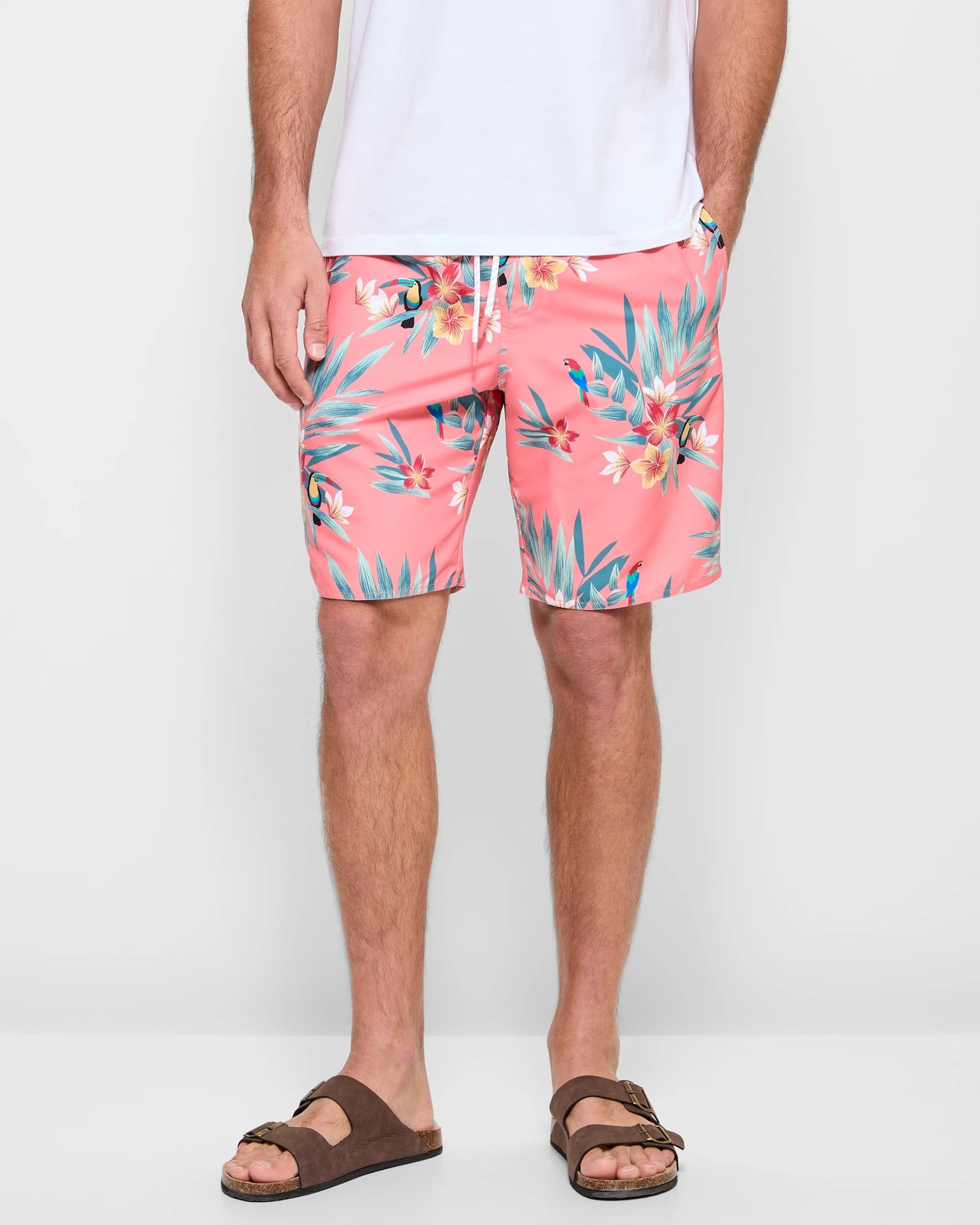 Step into summer with our men's Tropical Print Boardshorts. Perfect for beach outings or pool days, these shorts offer a comfortable regular fit and a stylish tropical design. The elastic waistband with drawstring ensures they stay put, while the side and back pockets provide practical storage. Dive into good times and make a splash with these must-have shorts, designed for both comfort and style!