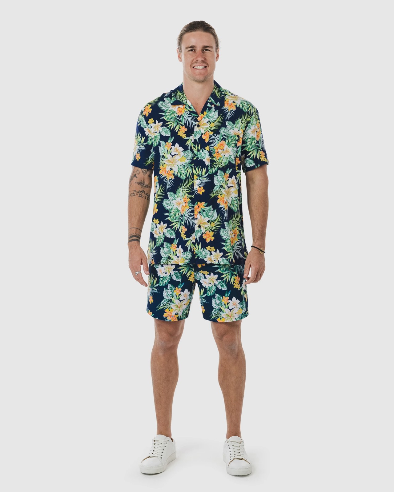 Easy wear volley shorts for the pool and the beach featuring a tropical print.