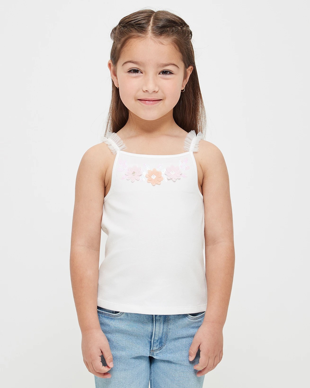 This regular fit singlet is made from a cotton rich fabric for ultimate comfort. The white singlet features a tulle spaghetti strap and a square neckline, with an eye-catching floral applique to the chest for an added touch of style. The straight hem is perfect for pairing with any of her favorite bottoms.