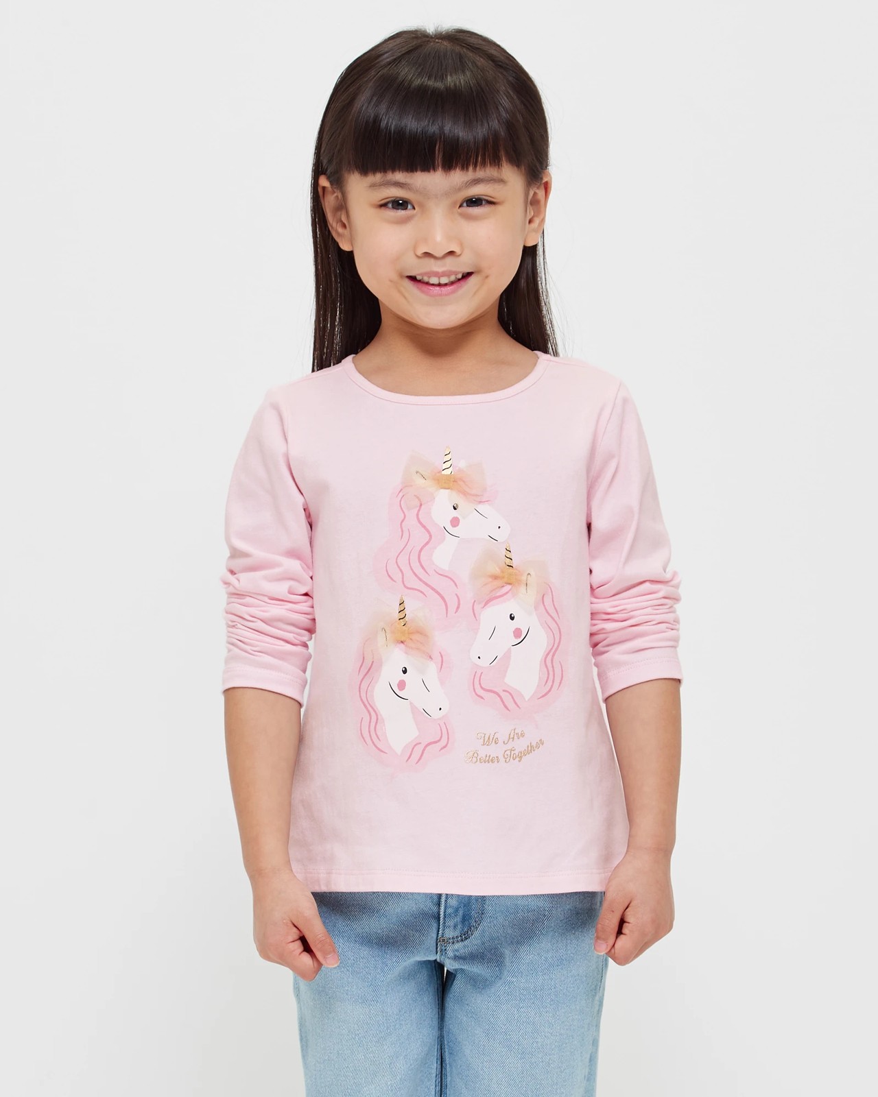 This fun and fabulous Tulle Unicorn Long Sleeve Top is perfect for any girl's wardrobe. It is made of a cotton rich fabric, providing a comfortable regular fit. The pink top features a round neckline with long sleeves and is decorated with an eye-catching foil print unicorn design and tulle bow appliques. The straight hem finishes the look perfectly, making this top perfect for everyday wear.