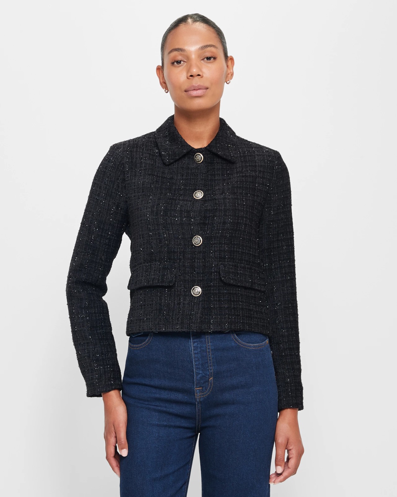 Introducing our Tweed Cropped Blazer - a stylish preview of what's to come! Crafted from a luxurious polyester/viscose blend, this blazer is both comfortable and fashion forward. With its fully lined interior and incorporation of recycled materials, it's a sustainable choice. The alluring tweed design adds a touch of sophistication, while the regular fit ensures a flattering silhouette. The round collared neckline and button-through front with decorative buttons create a chic look. Complete with long sleeves and mock fold-over top front pockets, this blazer is perfect for any occasion. Don't miss out on this must-have piece!