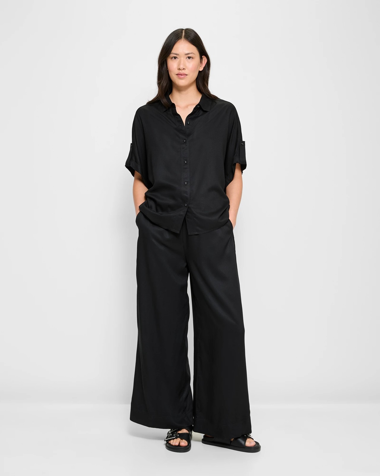 These pants are made from a lush viscose fabric paired with a stylish twill design. The pants feature a comfortably elasticated waistband equipped with an adjustable drawstring, ensuring your ease throughout the day. The wide leg cut and ankle-length style offer an effortlessly graceful shape. Side pockets add practicality, while the regular fit keeps your look both relaxed and polished. Don't miss out – pair these fashionable trousers with our matching shirt for the complete ensemble (sold separately).