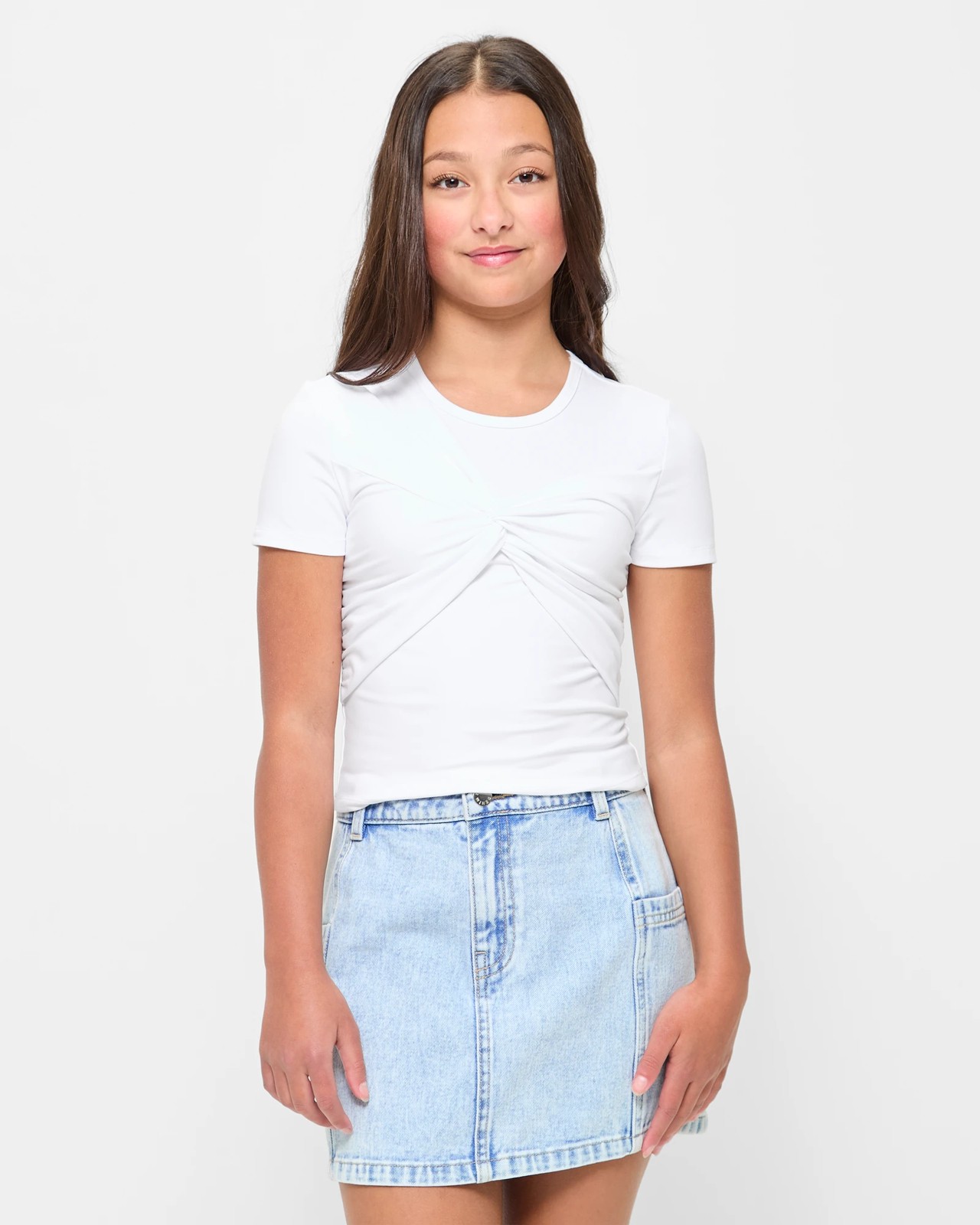 Step into style with our Twist Front T-shirt. Experience ultimate comfort with the great stretch that allows you to move freely throughout your day. Whether you're out for a casual outing or relaxing at home, our T-shirt is the perfect choice.Â