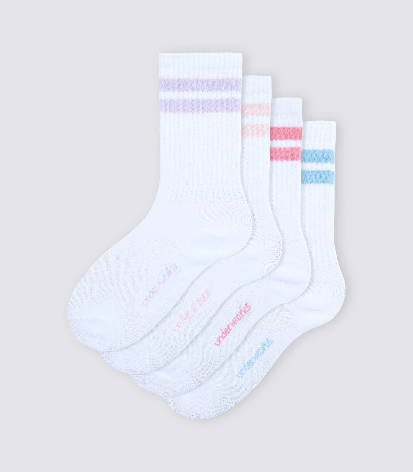 Wear. Play. Wash. Repeat. Underworks Kids striped rib crew socks are a great light weight sock that can be comfortably worn with any shoe type and provide long lasting comfort all day.