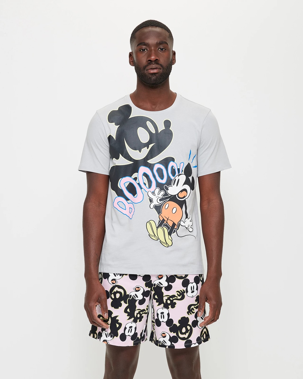 Introducing the Unisex Adult Family Matching Disney Mickey Mouse Glow In The Dark Halloween Cotton Pyjama Set! This two-piece set is made from a cotton rich fabric and features a ribbed crew neck, short sleeves, straight hem, and a fun glow in the dark Halloween Disney Mickey Mouse print to the front. The shorts have an elastic waistband and matching pink print. Available as a matching family set - sold separately - this pyjama set is perfect for getting into the spooky spirit of Halloween!