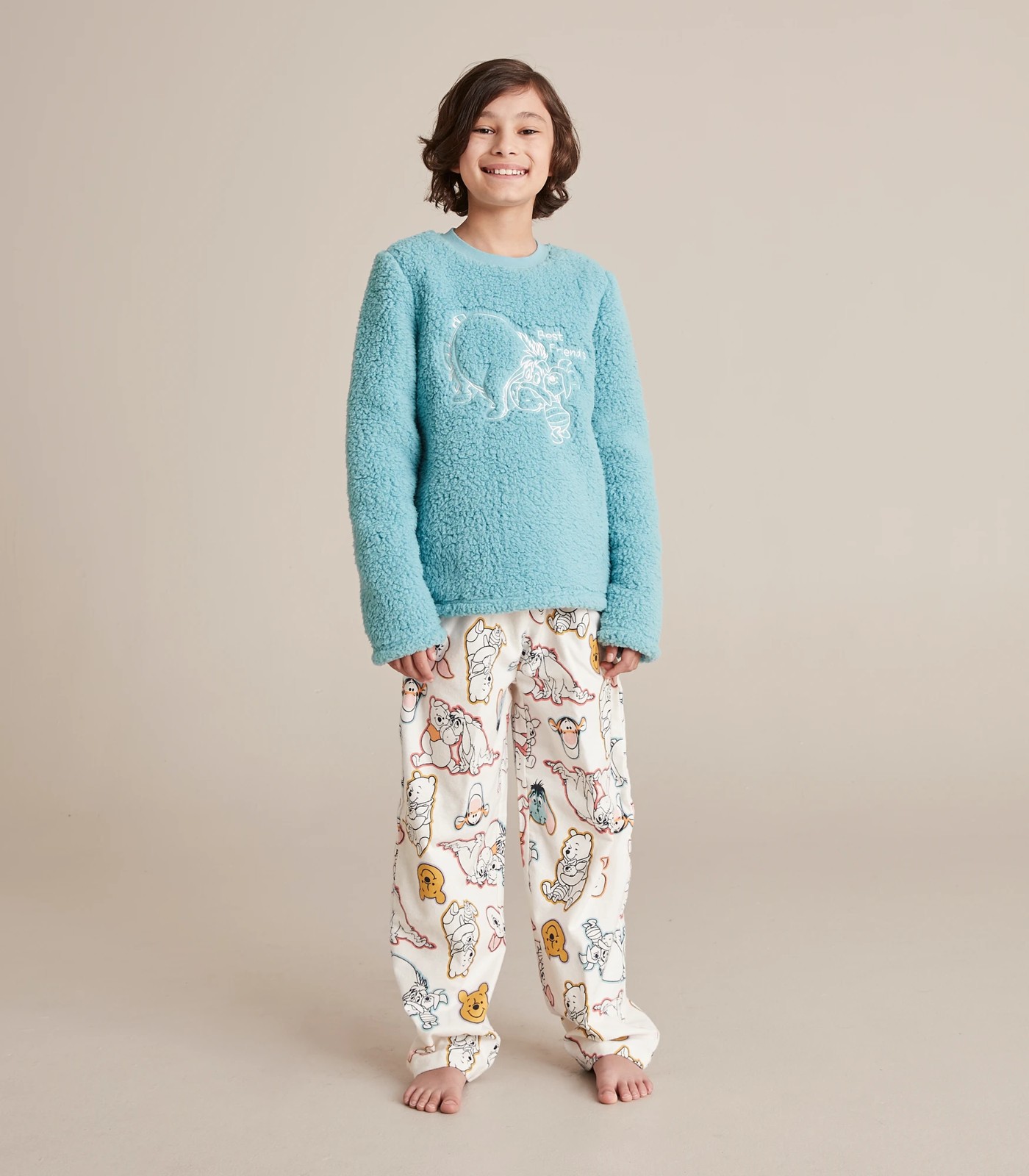 Collect the family set with the blue Unisex Kids Disney Winnie The Pooh Family Matching Fleece Pyjama Set. Featuring a long sleeve fleece top with Eeyore and Piglet embroidery to chest and matching all over print white flannelette pants.