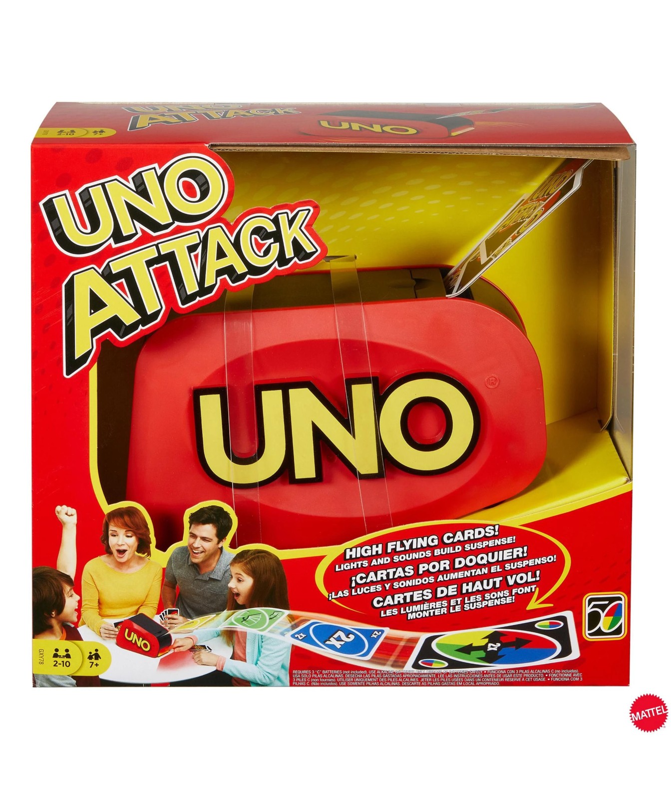 Brace yourself for an exciting, action-packed way to play UNO! If you draw the Attack! Attack! command card, you have to push the UNO Attack game's sleek electronic card shooter. If you're lucky, nothing will happen. But if you're not, the shooter will fire a stream of UNO Attack cards that you'll have to add to your hand! The shooter makes a variety of sounds to further increase the excitement. You can store the cards in the shooter, so the unit is both portable and storable. The goal is still to get rid of all the cards in your hand, and when you're down to one card, don't forget to yell, 'UNO!' Contains 112 cards, card shooter, and instructions. For 2 to 10 players, ages 7 and older. Colours and decorations may vary.