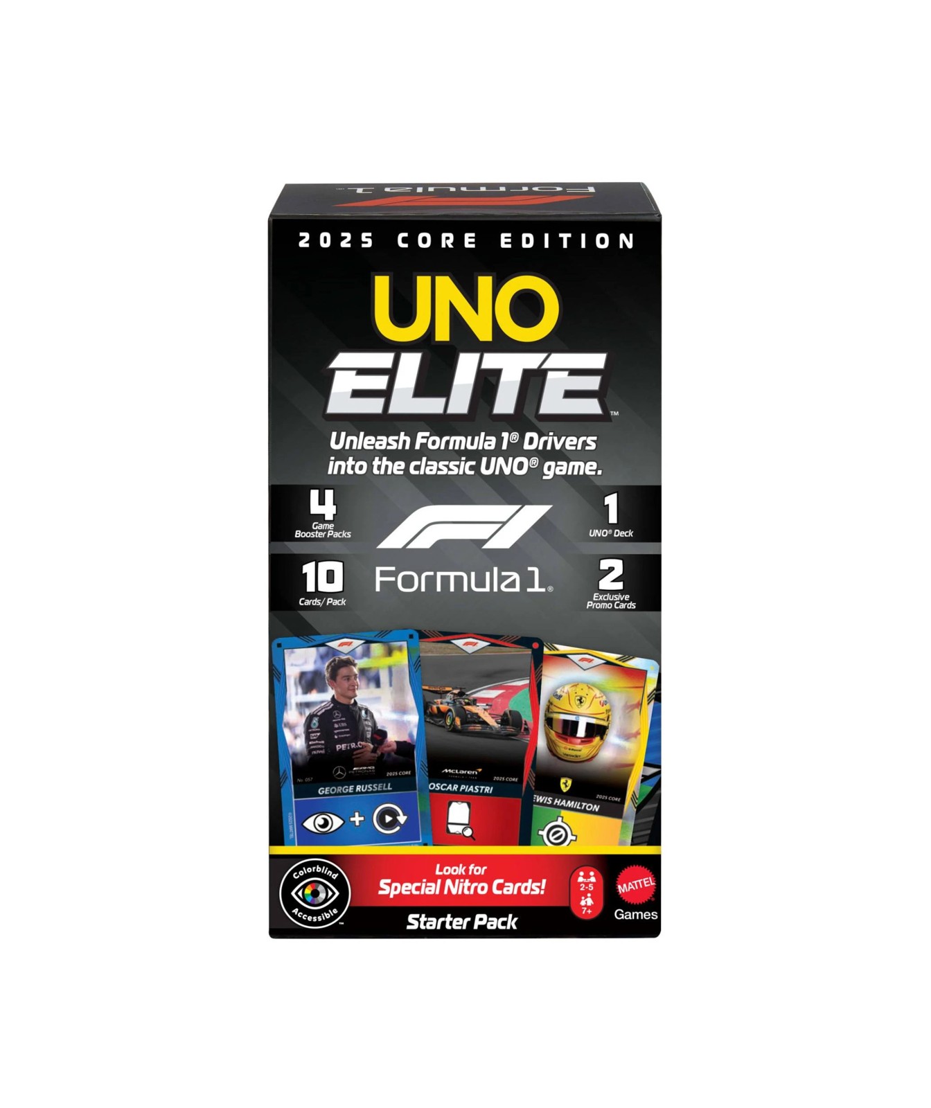 This high-octane UNO Elite Formula 1 card game fuses the strategy of classic UNO with the adrenaline of Formula 1 racing! The excitement starts with a full deck of 112 UNO cards and picks up speed with 40 randomized Formula 1 Elite Action Cards (in four Game Booster Packs) and two Promo Cards. UNO Elite Formula 1 plays like classic UNO, but actions like Skip and Reverse are found on the Elite Action Cards. Each Elite Action Card comes with its own special power that activates when a game player plays a card with an Elite icon on it. And when down to the last card, don't forget to yell 'UNO!' The racing-themed game makes a thrilling gift for Formula 1 fans and card game lovers ages 7 years old and up. Colors and decorations may vary.