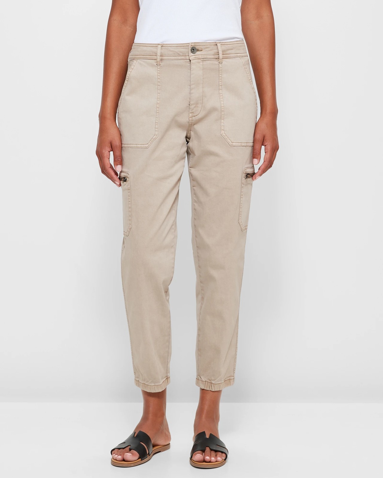 Introducing our Utility Stretch Twill Pants for women. These pants are crafted from a cotton rich fabric that offers both breathability and durability. With added stretch, they provide maximum comfort for everyday wear. The regular fit and mid-rise waist ensure a flattering silhouette, while the structured waistband with belt loops adds a touch of sophistication. Designed with functionality in mind, these pants feature exposed front pockets and side thigh utility pockets with zip closure. The straight cut legs and ankle length create a versatile look that can be dressed up or down. Complete with straight hemline and back open top spade pockets, these pants are a must-have addition to your wardrobe. Take action and elevate your style with our Utility Stretch Twill Pants!