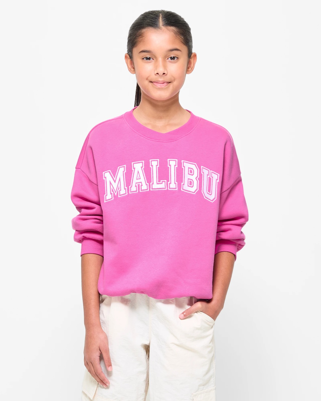 Step up your style game with our cosy V Neck Malibu Jumper. Embrace the softness of cotton-rich fabric and the chic ribbed V neck design. Perfect for every season, the long sleeves with ribbed cuffs provide a flattering fit. Adorned with Malibu embroidered details on the front, feel confident and stylish wherever she is. Stay snug with the fleece-lined warmth and show off her fashionable edge with the straight ribbed hem. Be warm, be trendy – embrace the Malibu vibe today!