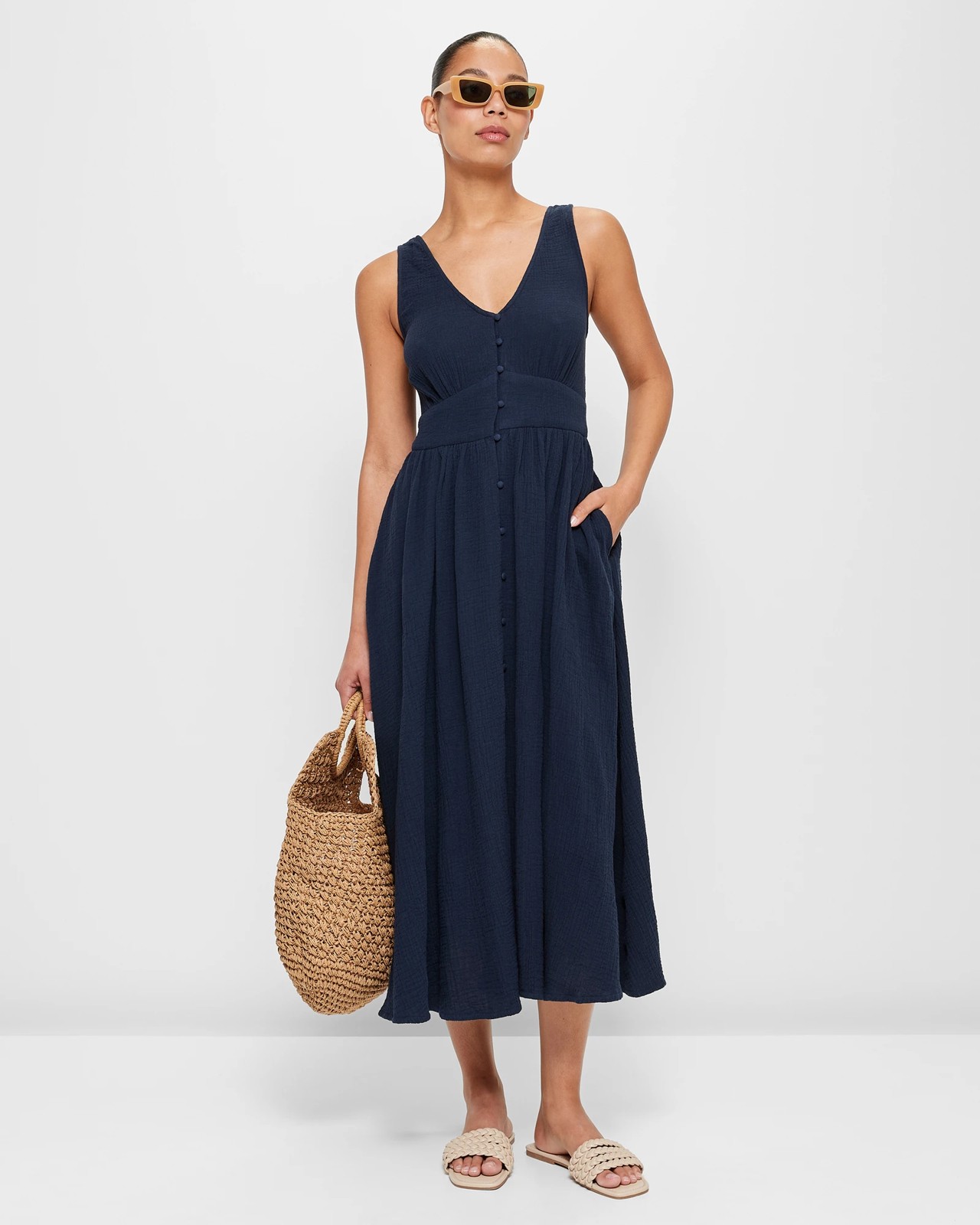 Introducing our V-neck maxi dress, made from a breathable cotton fabrication. This textured navy blue dress features a button through front and a beautiful elasticated back panel with a tie up feature. Look and feel your best while wearing this unique and fashionable maxi dress this summer!