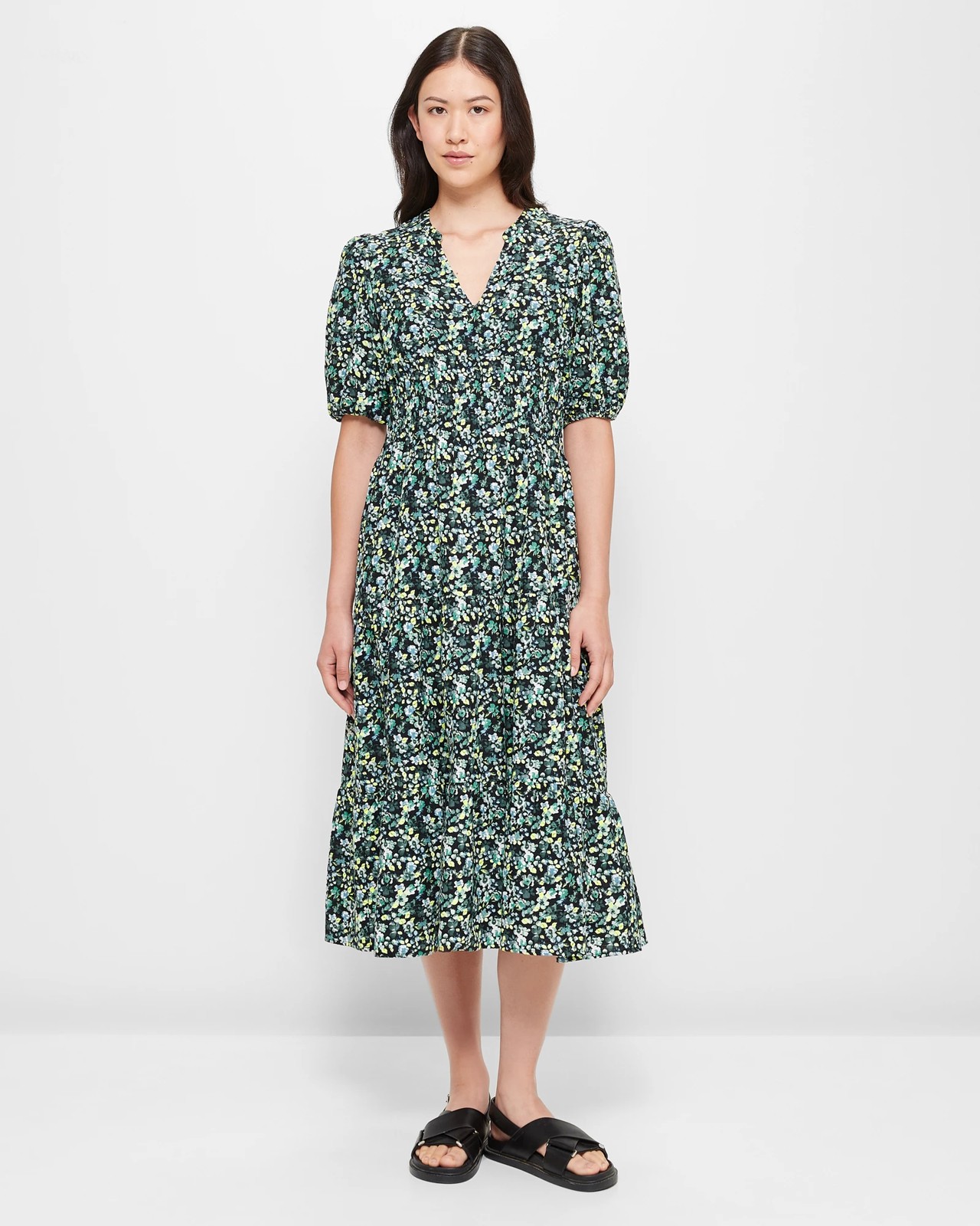 Introducing our V-Neck Midi Dress for women. Crafted with a luxurious blend of cotton and viscose, this dress offers ultimate comfort and style. The textured material adds a touch of sophistication, while the regular fit flatters all body shapes. The round neckline features a v-front drop, creating an elegant look. With gathering around the shoulders and short puff sleeves with elastic cuffs, this dress adds a feminine touch. The shirred elastic waistband defines your waist, while the tiered bottom panels create a flowy silhouette. Sitting elegantly at a midi length, this dress is perfect for any occasion. Upgrade your wardrobe with our V-Neck Midi Dress today!