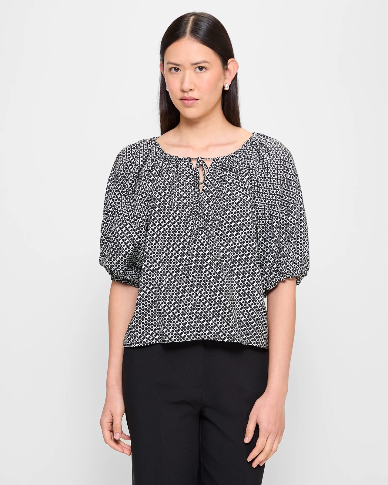 Introducing the V-Neck Puff Sleeve Blouse from Preview. Experience the ultimate comfort with this blouse, made from a luxurious viscose/nylon blend that feels soft to the touch. Its regular fit flatters all body types, while the striking colours add a touch of elegance. The round tie front neckline with v-front drop adds a stylish detail. The short elastic cuff sleeves provide a relaxed and trendy look and the straight hemline offers a polished finish. Whether you're going for a casual outing or a formal event, this blouse will never disappoint. Get yours today and elevate your wardrobe to new heights.