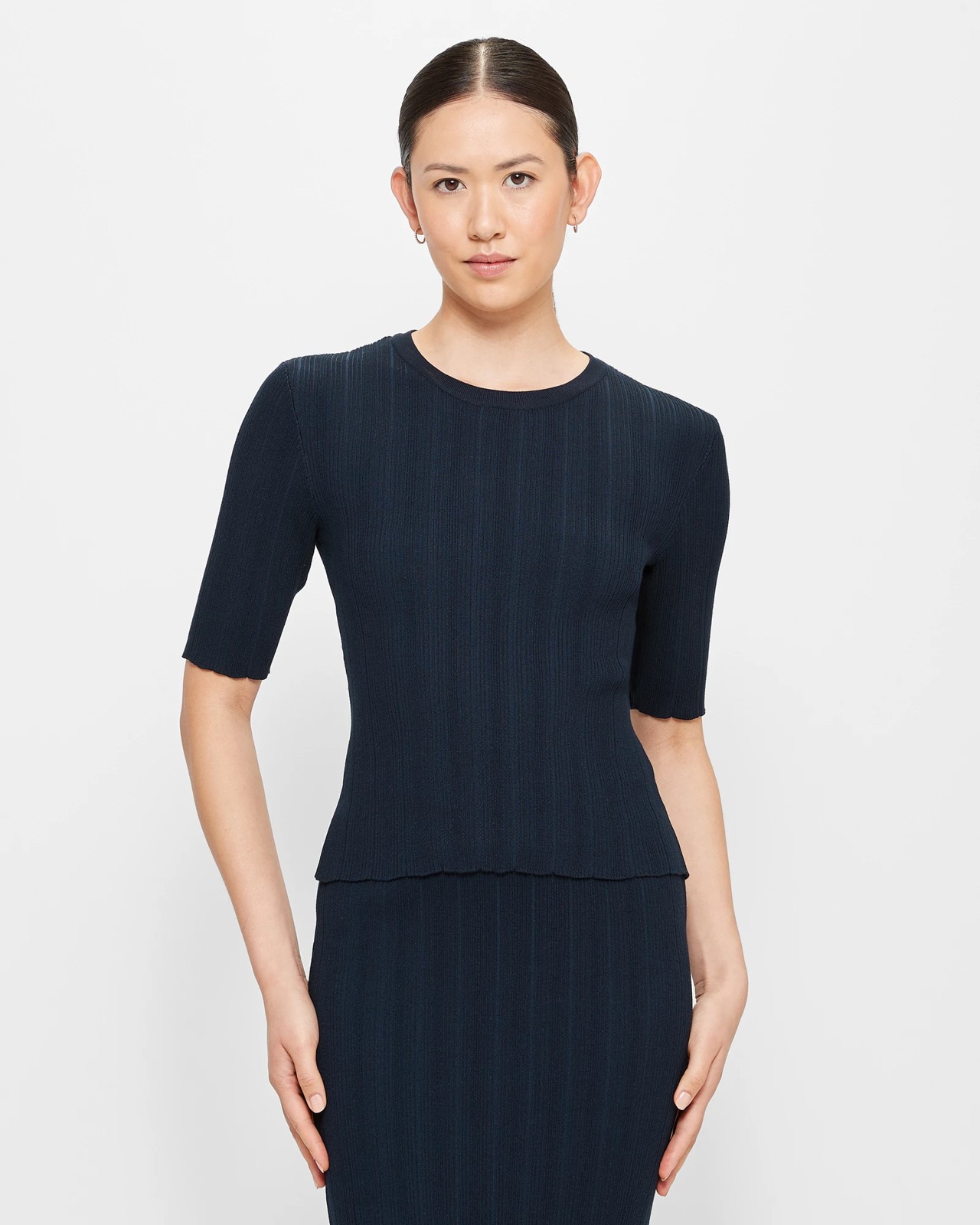 Introducing our new Variegated Crew Neck T-Shirt by Preview! Made from a blend of soft viscose and nylon, this tee features Lenzing EcoVero branded viscose fibres that are sustainably sourced. The all-over ribbed design adds a trendy touch to the classic navy blue colour. With its regular fit, crew neckline, and short sleeves, this t-shirt offers comfort and style. Perfect for any casual occasion, the straight hemline provides a neat finish. Add this versatile piece to your wardrobe today and elevate your everyday outfits. Don't miss out - get yours now!