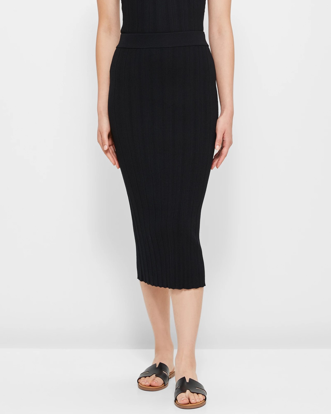 Introducing our Variegated Tube Midi Skirt, the perfect addition to your wardrobe. Made from a high-quality viscose/nylon blend, this skirt combines style and comfort. The skirt features EcoVero branded viscose fibres, making it an eco-friendly choice. With its all-over ribbed knit design, this skirt offers a unique texture and a flattering fit. The thick ribbed flat elastic waistband ensures a comfortable and secure fit. The pencil cut and straight hemline create a sleek silhouette, while the midi length adds a touch of elegance. Whether you're going for a casual look or dressing up for a special occasion, this skirt is versatile and stylish. Don't miss out on this must-have piece for your wardrobe. Shop now and add a touch of sophistication to your outfit!