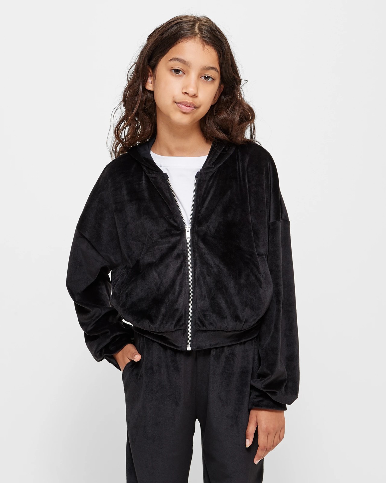 Indulge in luxury with our Velour Zip Hoodie! Crafted from soft velour fabric and designed with a regular fit, hood, and zip front, she'll be wrapped in comfort all day long. The hoodie features front pockets and a straight hem for added convenience. Complete the look with the matching trackpants available separately!