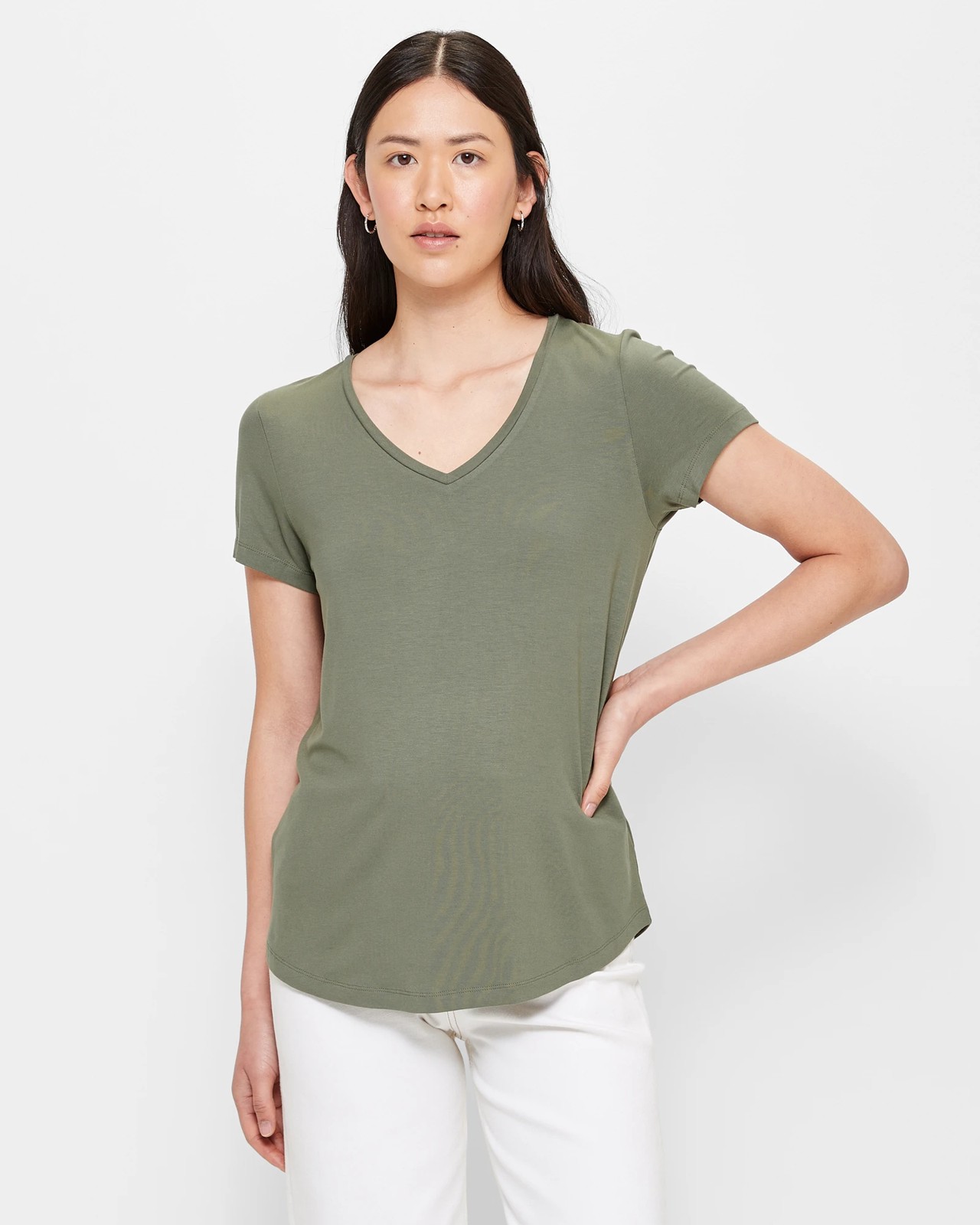 For a touch of comfort, this V-Neck T-Shirt from Target Woman has it all. Crafted from a soft viscose rich fabrication with just the right amount of stretch for added comfort, this t-shirt features a regular fit with a flattering v-neckline and short sleeves. It's finished with a curved hemline for an extra feminine touch. Perfect for everyday wear!