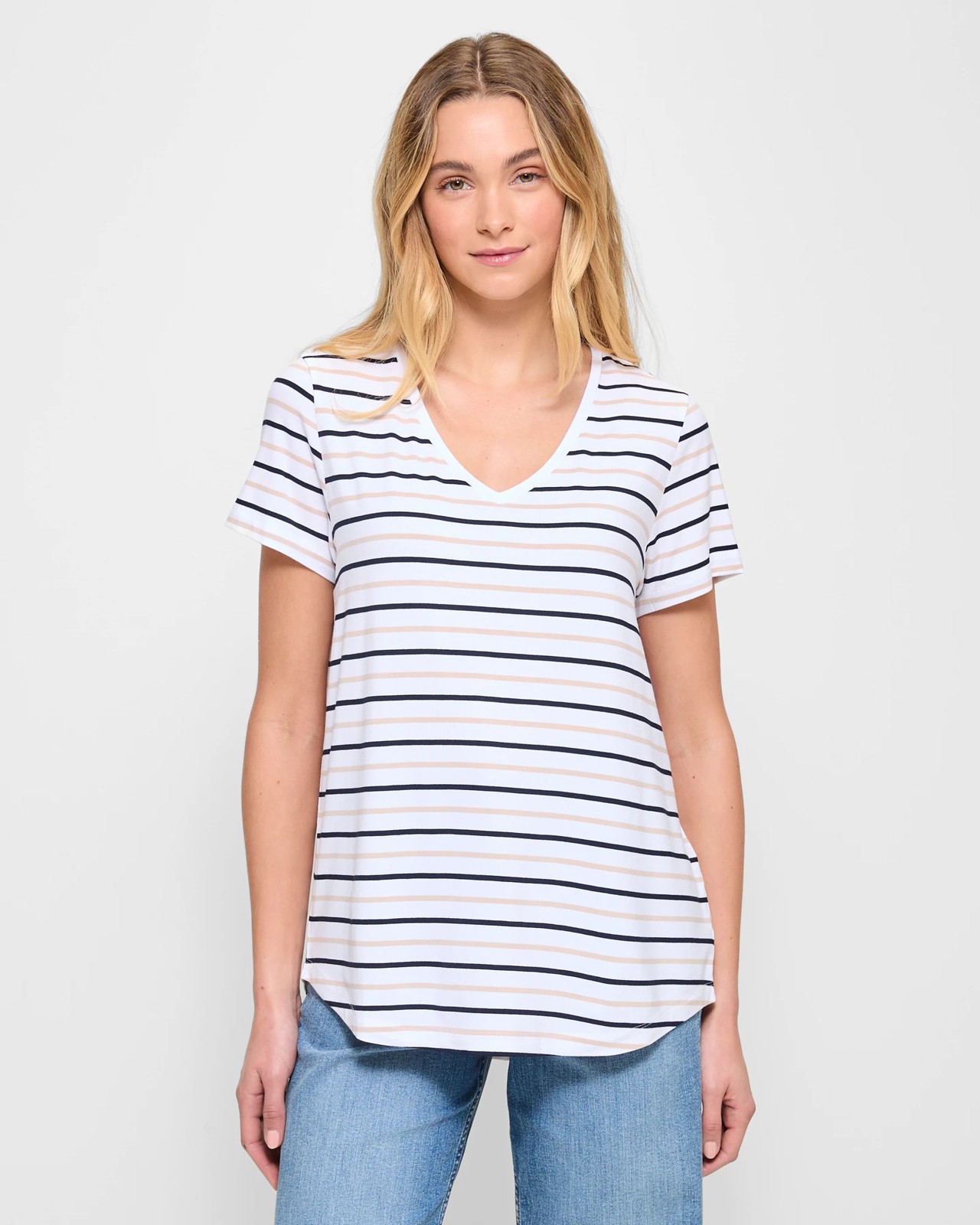 Indulge in comfort with our Viscose/Elastane V-Neck T-Shirt. Enjoy the softness and stretch of the fabric, providing a perfect fit and ease of movement. The stylish V-neckline, short sleeves, and curved hemline make for a chic and versatile addition to your wardrobe. Perfect for any occasion, whether you're running daily chores or heading for a casual outing. Treat yourself to the soft viscose material and trendy design. Upgrade your style effortlessly with our V-Neck T-Shirt!