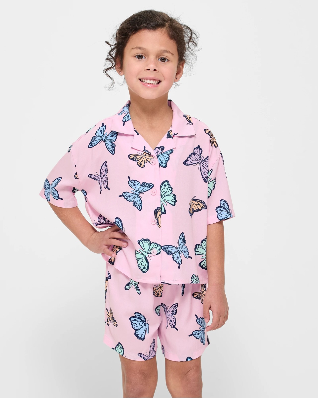 Envelop your little one in comfort with our Viscose Pyjama Set adorned with enchanting butterfly prints. Perfect for a peaceful night's sleep, this two-piece set features a collared, button-down top with short sleeves and matching elasticated shorts. Made from soft viscose, it ensures a relaxed fit and ease of movement. This delightful pink sleepwear keeps your girl stylish and cosy, for a relaxing and sweet dreams. Pick up this charming set today and bring a touch of magic to bedtime.