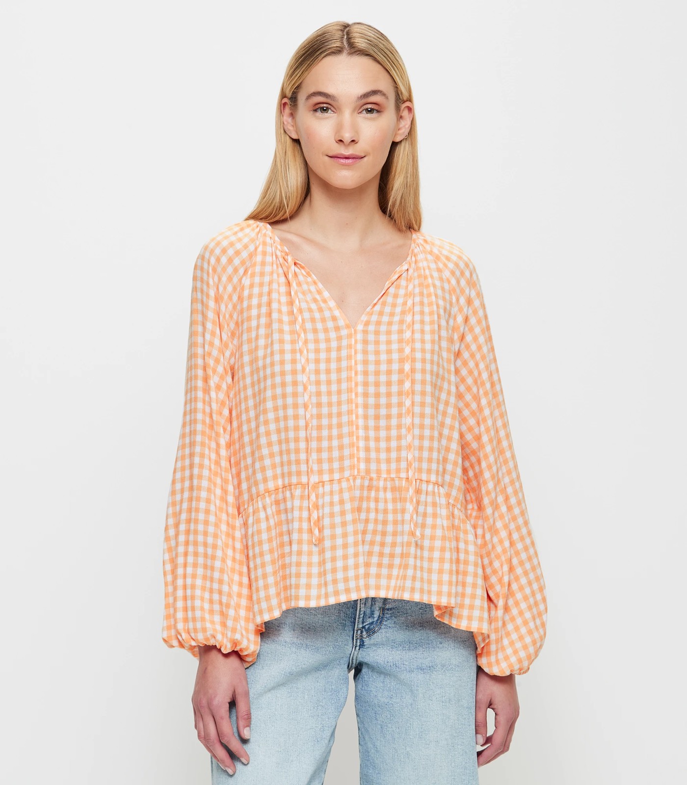 A great top for everyday wear that is lightweight and comfortable, the volume sleeve blouse has a round neckline with a v-front drop and tie up front, long volume sleeves and a high-low hemline to flatter your shape.