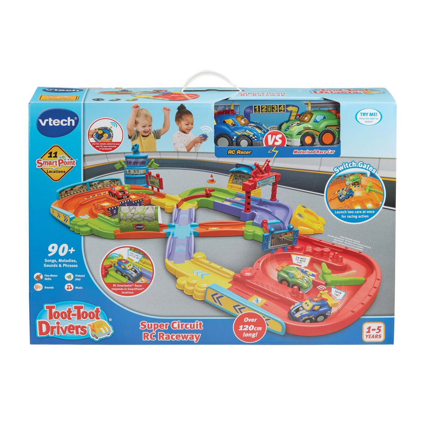Ready, set, go go! Wave those flags and start the race full of twists and turns with the Toot-Toot Drivers Super Circuit RC Raceway. Grip the easy-to-use controller to drive the RC Racer or dock the remote in the helpful steering station, freeing up both hands to drive the car forward and backward. Challenge the Motorized Race Car and get in on the racing action as both cars zoom and zigzag around the circuit.