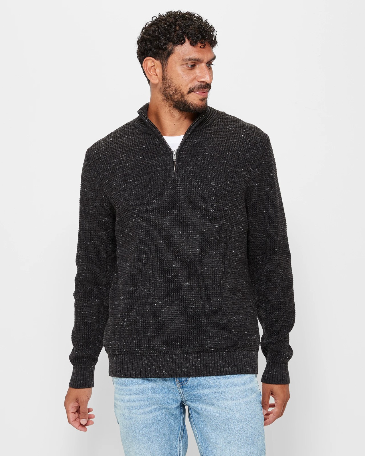 Great for everyday wear with your favourite bottoms, the Waffle Half Zip Knit Jumper features an all over rib knit design, funnel neckline with half zip closure and long sleeves.