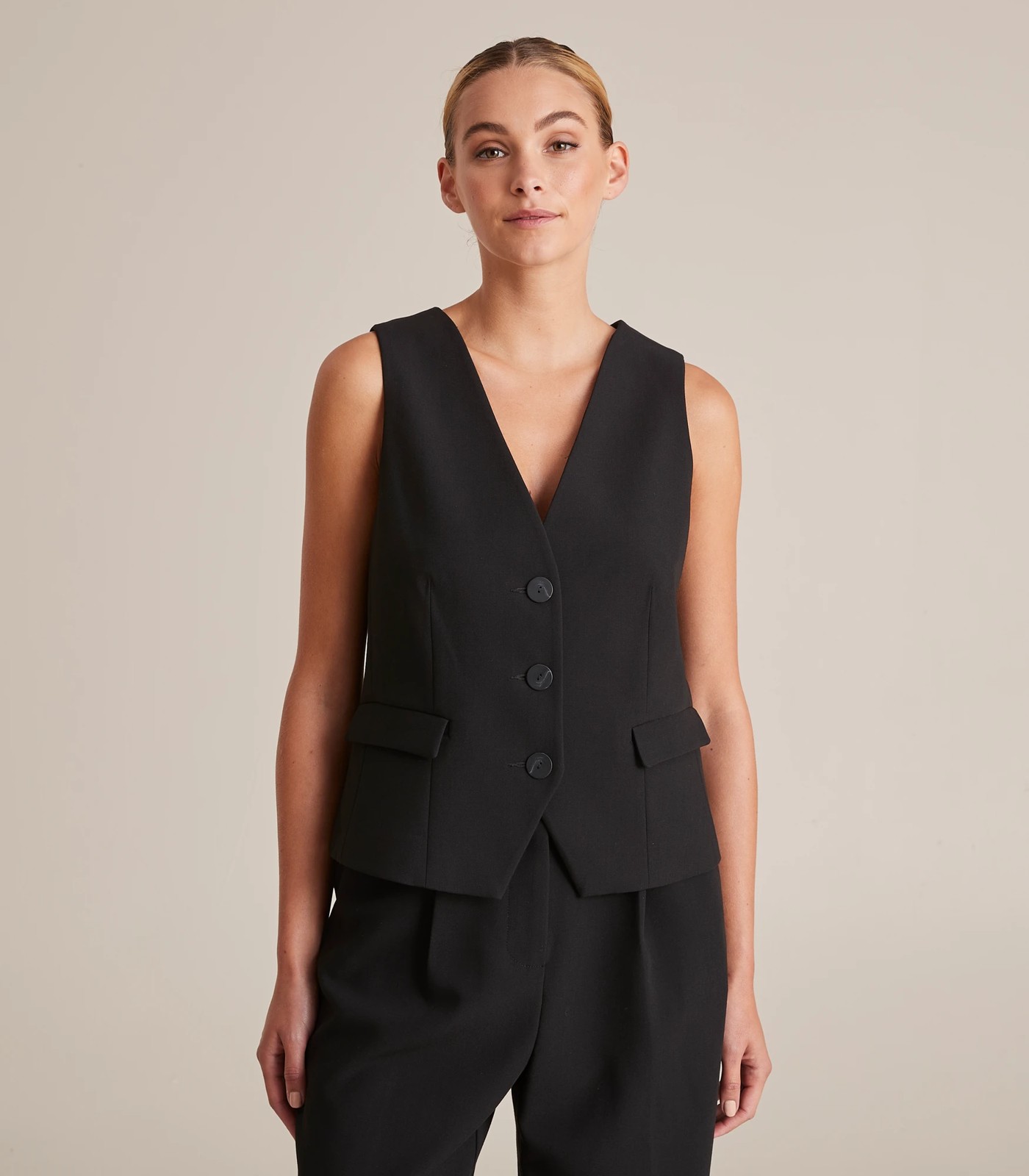 Introducing our newest waistcoat! This fully-lined regular fit waistcoat is perfect for your next day out. With a black V-neckline, sleevless design, and thick shoulder straps, this waistcoat can be worn open or closed. The button-through front and front fold-over top pockets make this waistcoat both stylish and functional. The straight hemline and stretch fabric blend make this waistcoat both comfortable and stylish. Whether you're headed to the office or the outdoors, this waistcoat is a must-have for your wardrobe.