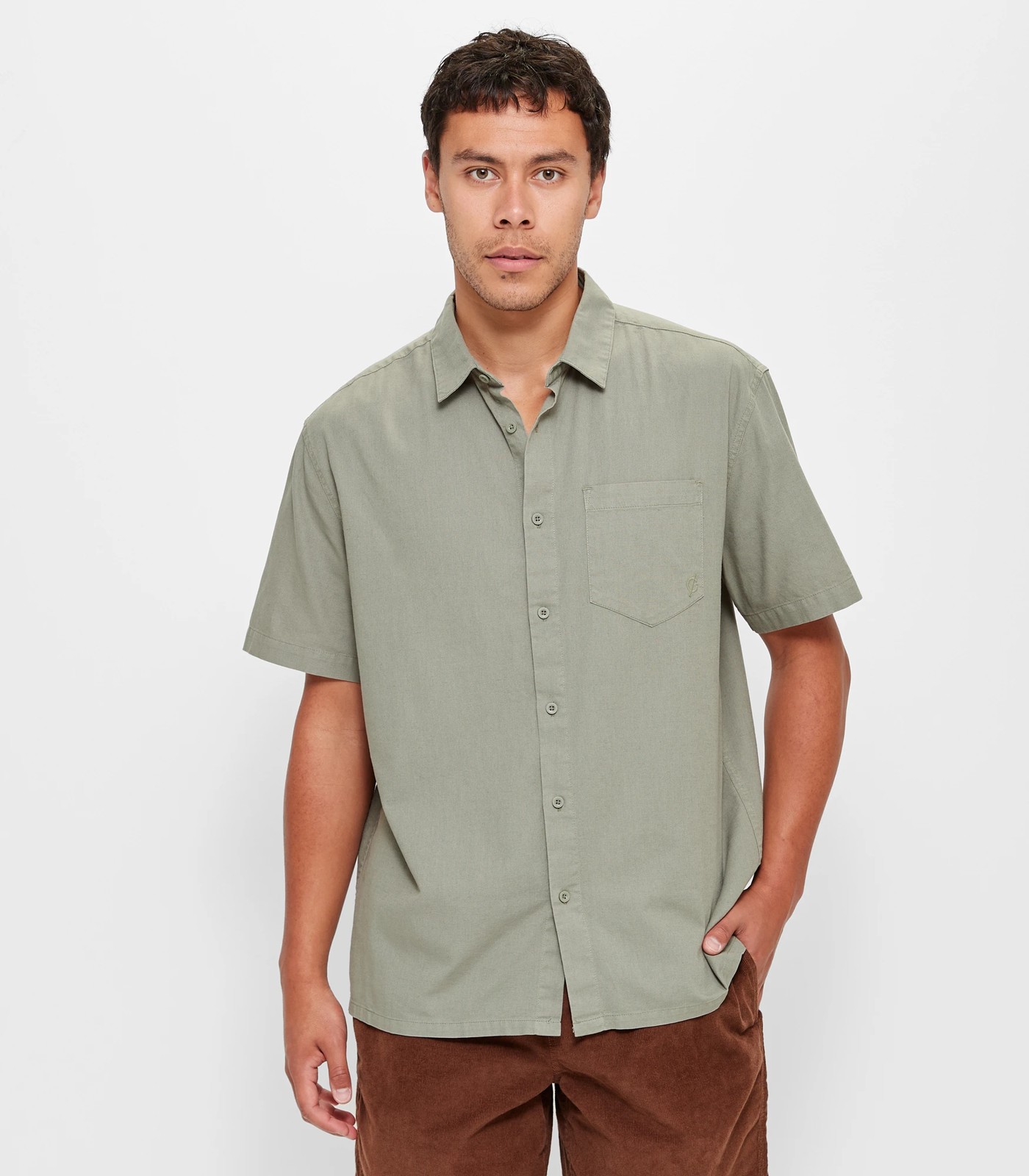 Introducing our Men's Washed Shirt - Commons. Crafted from a comfortable blend of soft cotton and linen, this shirt is perfect for warm summer days. The regular fit offers a relaxed and stylish look, while the colllared neckline and button-down front add a touch of sophistication. The sea spray green colour adds a refreshing pop to your wardrobe. With its short sleeves and hi-low hemline, this shirt is versatile for casual or smart-casual occasions.