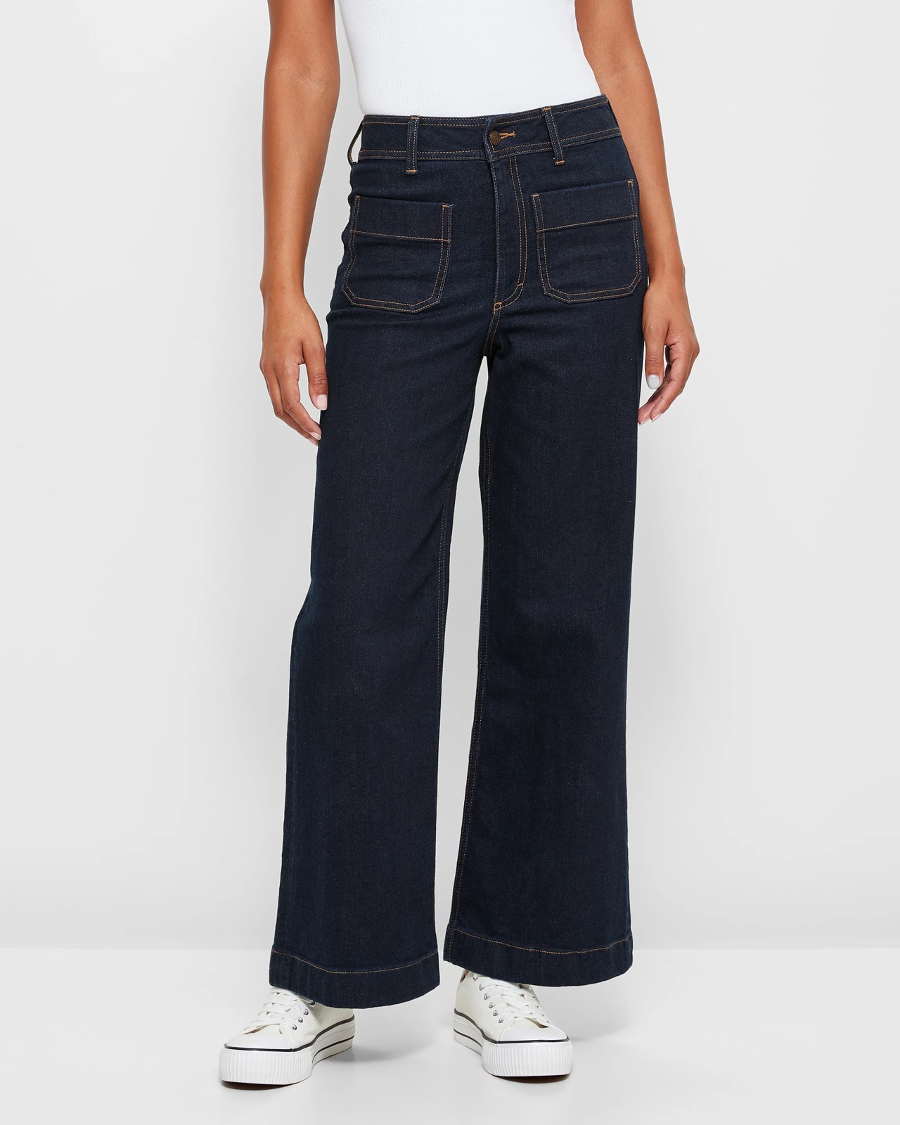 Introducing the Mila Denim Jeans, a perfect blend of style and comfort. Crafted from a breathable cotton-rich fabric with stretch for all-day wearability. These jeans feature a regular fit and a high-rise waist for a flattering silhouette. The structured waistband is equipped with belt loops for added convenience. With front button and zip fastening, these jeans offer easy and secure closure. The wide leg design adds a trendy touch while the straight hemline ensures a polished look. Complete with large open back pockets, these jeans combine functionality with fashion. Upgrade your denim collection with the Mila Denim Jeans today!