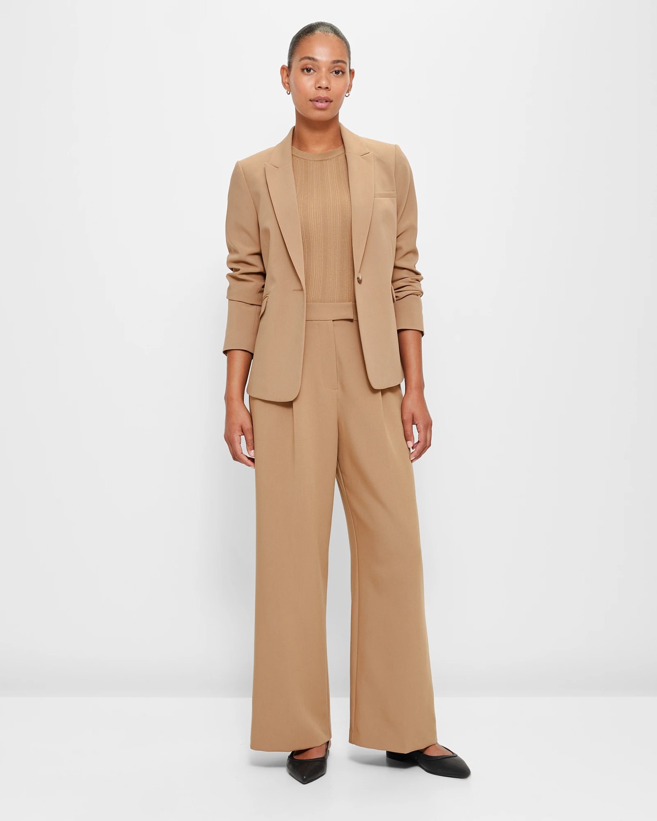 Get a preview of our stylish Wide Leg Pants. Made from a luxurious blend of polyester and viscose, these pants offer the perfect balance between comfort and style. The stretch fabric ensures a comfortable fit, while the tailored cut and structured waistband with belt loops create a polished and sophisticated look. With front hook and eye closure, zip, and inner button for added support, these pants are designed to flatter your figure. The permanent pleats down from the waistband add an elegant touch, while the side pockets provide convenience. The wide leg design and ancle length give these pants a fashionable edge. Complete the look with the back pockets for extra functionality. Don't miss out on this must-have wardrobe staple. Shop now!