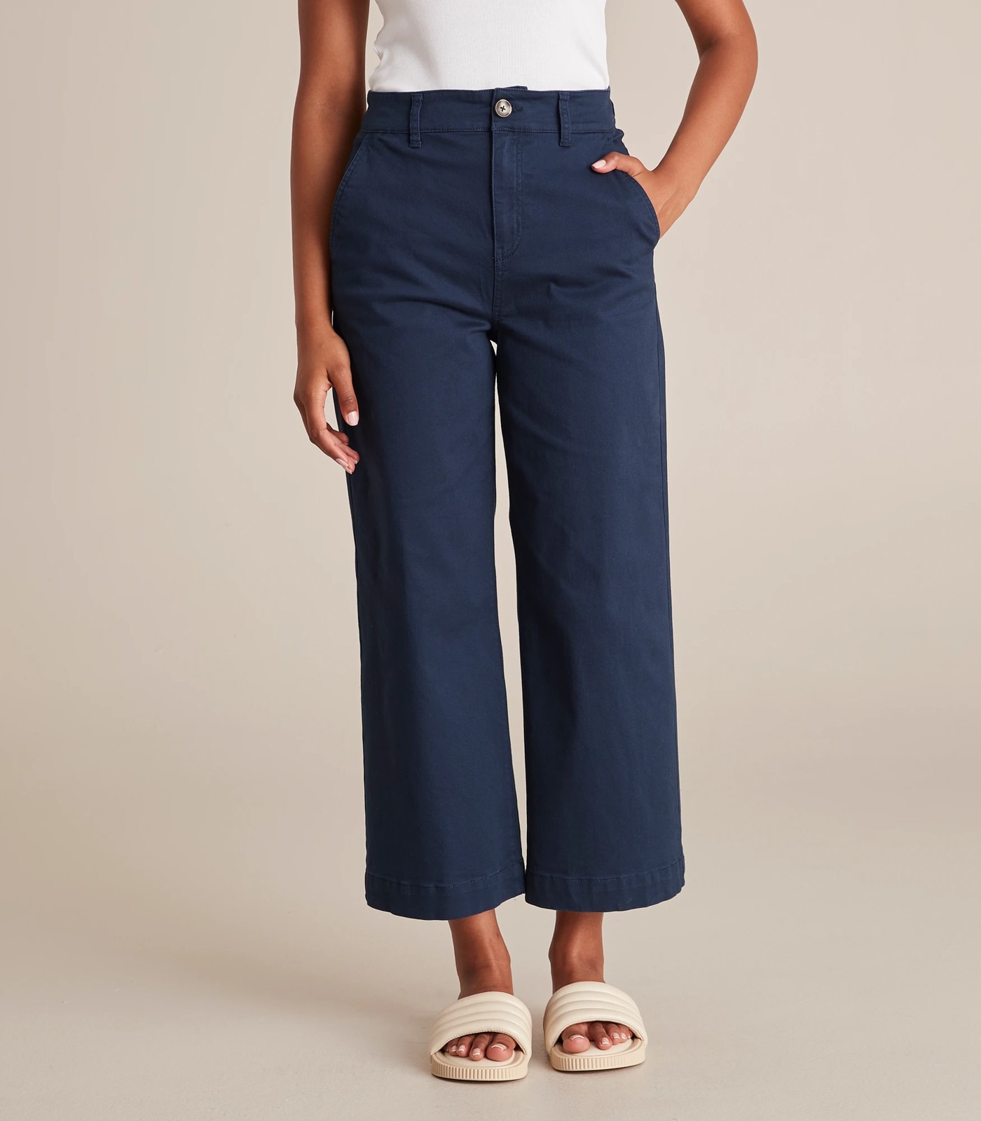 Looking for a great pant to get about your day? Then the wide leg stretch twill pants will have you looking incredible and feeling light and ready to go. They feature a wide leg design, a structured waistband and large pockets to hold all of your essentials.