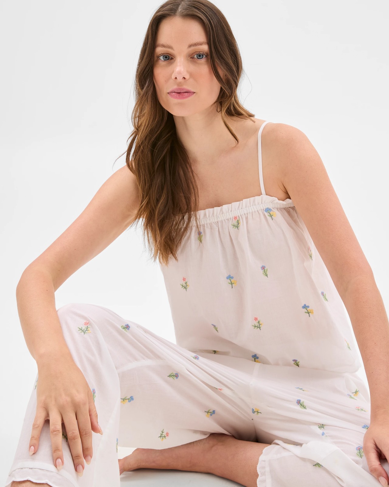 Womens Australian Cotton Embroidered Cami Long Pyjama Set