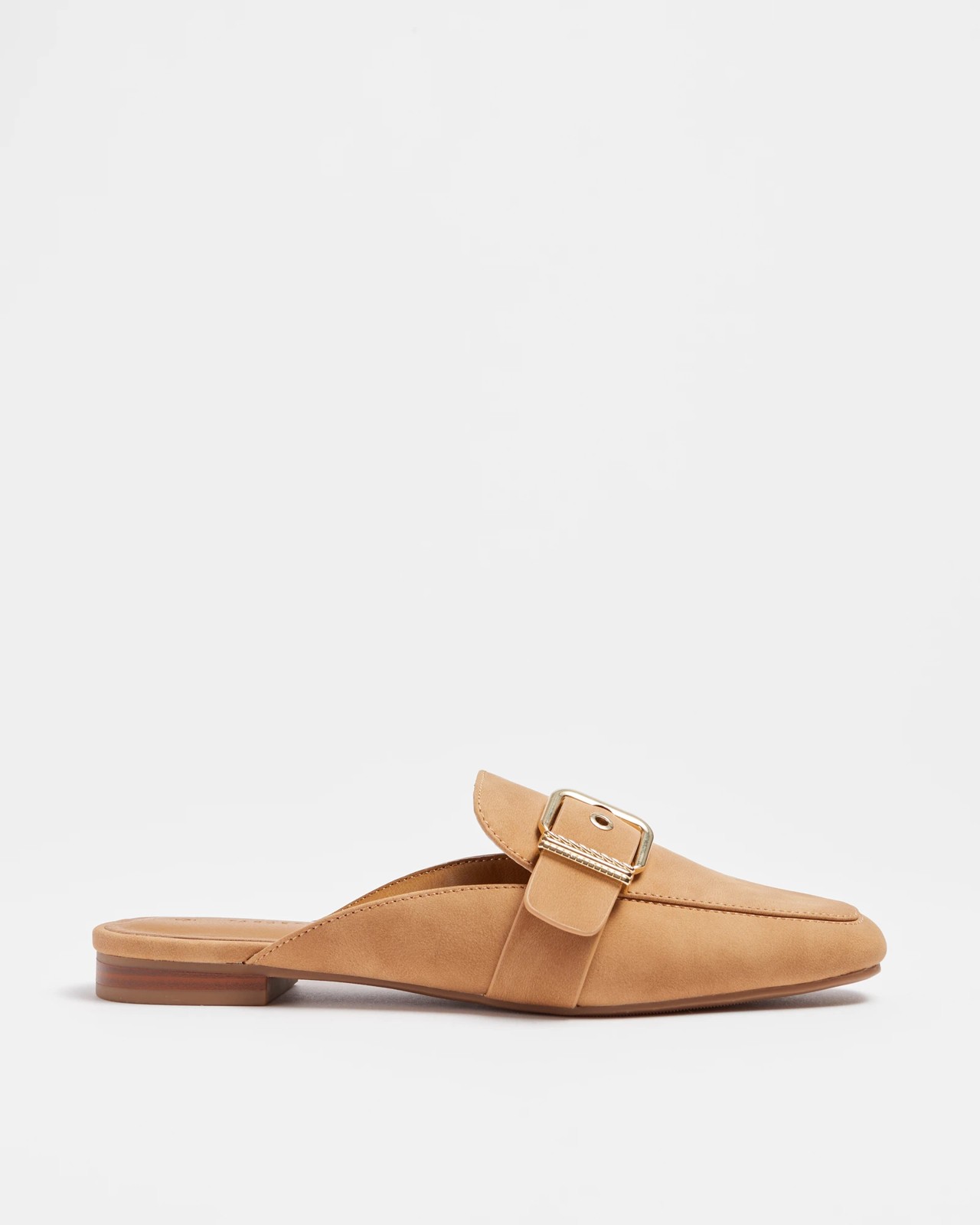 Step into style with our Women's Cairo Buckle Mule Loafer. Crafted with a sleek leather-look synthetic upper and featuring a chic gold buckle strap, these loafers exude sophistication and elegance. The closed apron front and square toe add a touch of modern flair, while the slip-on style and open back ensure effortless wearability. With a padded footbed and 1.5-inch stacked veneer heel, these loafers offer comfort without compromising on style. Treat your feet to both fashion and comfort with these versatile and elegant mule loafers.