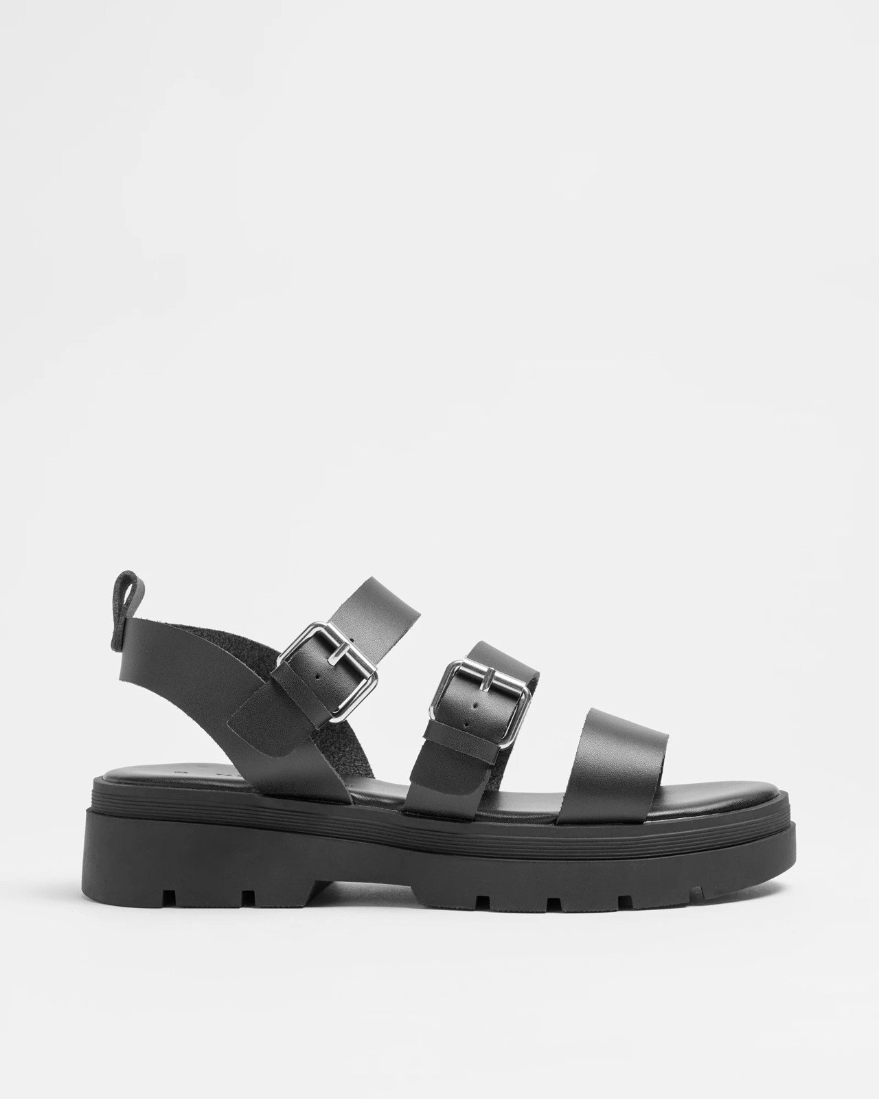 Step into style and comfort with our women's chunky buckle sandals. Crafted from a sleek leather-look synthetic material, these black sandals feature a chic open round toe and eye-catching silver double buckle upper. The chunky 4cm flatform cleated sole provides stability and a trendy silhouette. The back ancle strap with back pull tab ensures a secure fit, while the padded sockbed adds extra comfort. Perfect for casual outings or a day at the beach, these sandals are a must-have addition to your footwear collection. Elevate your look with a pair today!