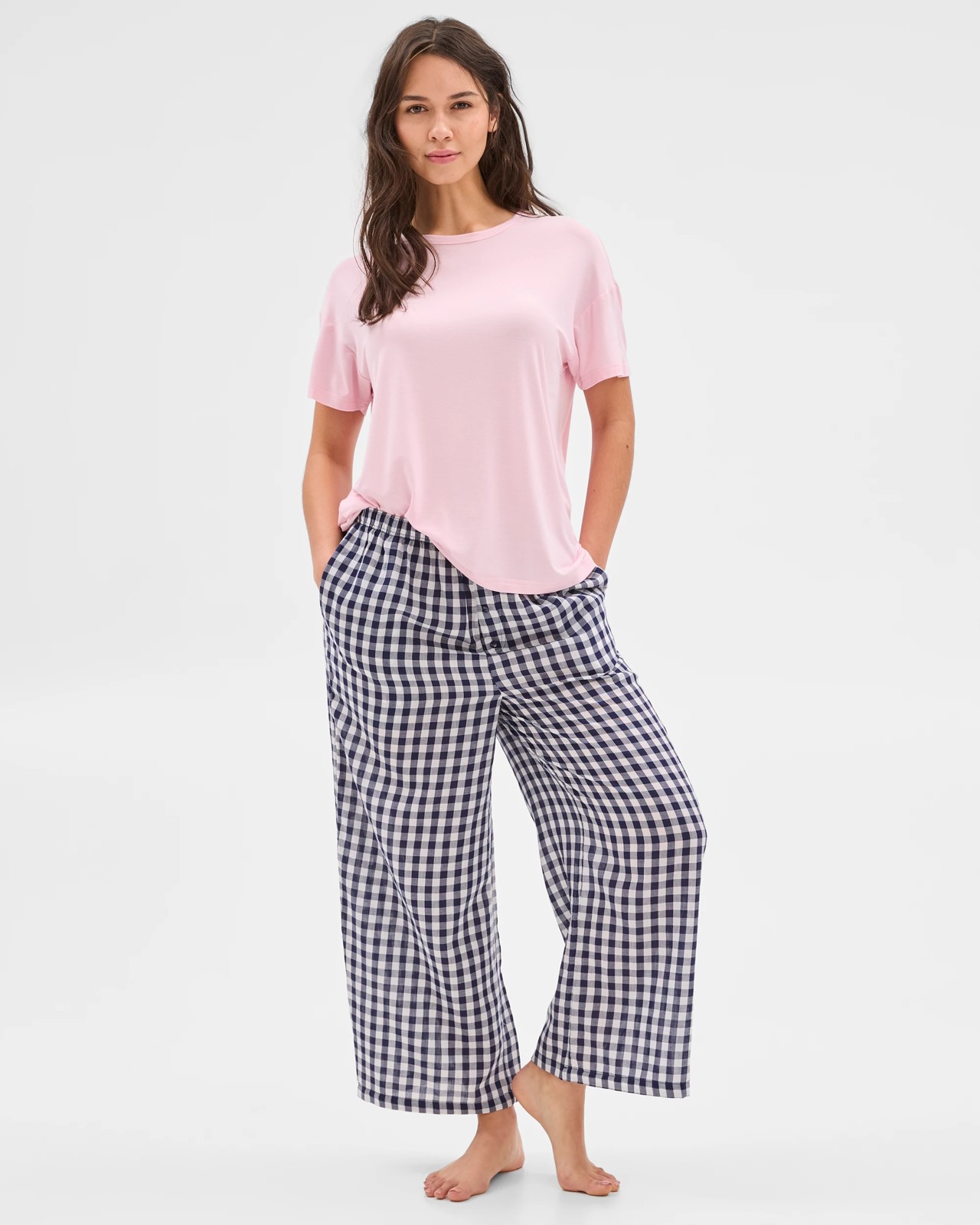 Experience unrivalled comfort with these women’s pyjama pants, fashioned from ultra-light cotton voile for a soft and breezy feel. Their navy gingham pattern adds a playful flair, while the relaxed fit and elastic waistband let you move with ease. The stylish cropped length and straight hemline provide a chic touch, perfect for leisurely mornings or unwinding at night. Designed with practical side pockets and a button-effect fly, these pyjama bottoms are set to become your favourite choice for both sleeping and lounging. Refresh your nightwear and enjoy cosier evenings today.
