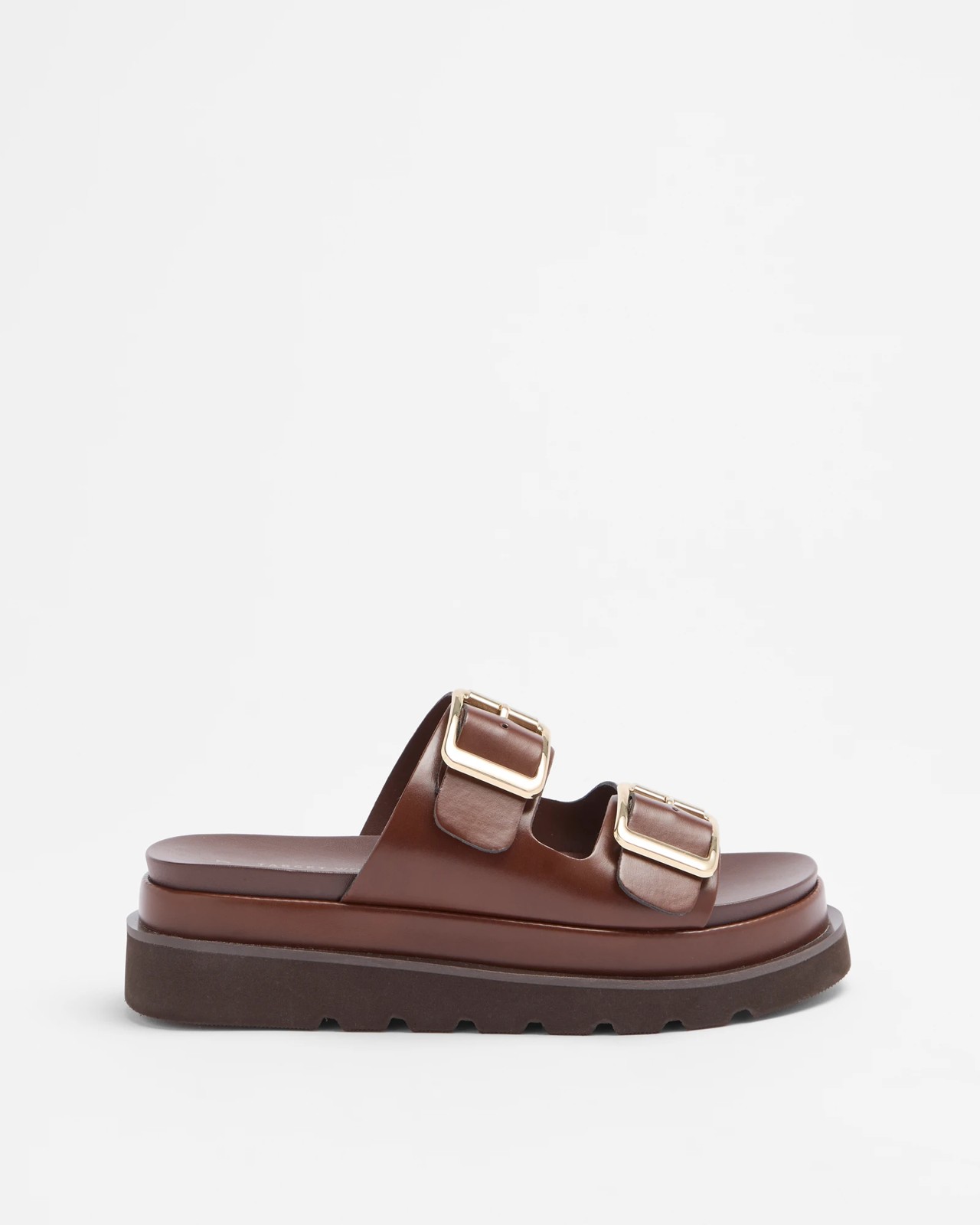 Step out in style with the Womens Aleesha Double Strap Chunky Sandal. Perfect for a laid-back day or a casual outing, this sandal features a trendy double strap design with adjustable gold buckles for the perfect fit. The moulded footbed ensures comfort throughout the day, while the 4cm flatform adds a touch of height without sacrificing ease. With a sleek round open toe and a slip-on fit, these sandals are both fashionable and convenient. Make them a staple in your wardrobe today!