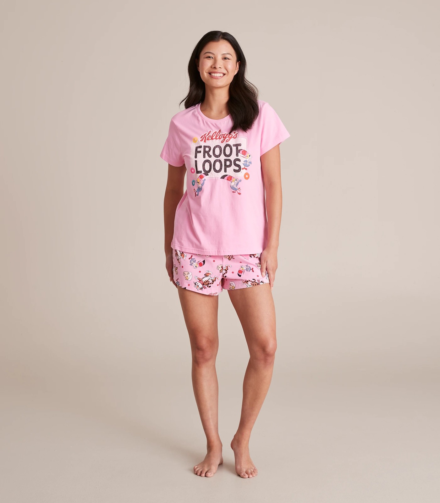 Collect the matching family set, with the pink Womens Family Matching Kellogg's Cotton Pyjama Set, featuring a short sleeve top with large Froot Loops chest print, matching all over print shorts and crafted from soft cotton for all night comfort.