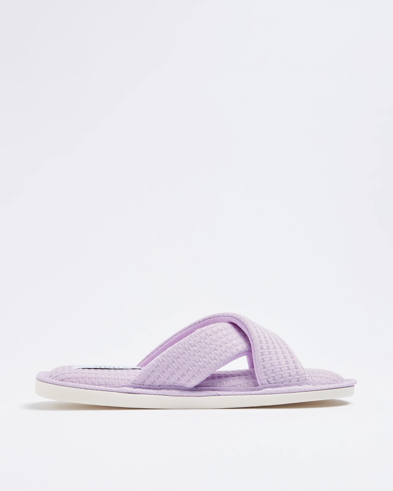 Take comfort to the next level with these Womens Hayley Waffle Jersey Scuff Slippers. Crafted with a super soft and textured material, these slippers feature a crossover band accross the vamp for added style. The underfoot cushioning provides extra comfort, while the open toe and durable, non-slip sole makes them perfect for everyday wear. Experience luxury and relaxation with these Womens Hayley Waffle Jersey Scuff Slippers.