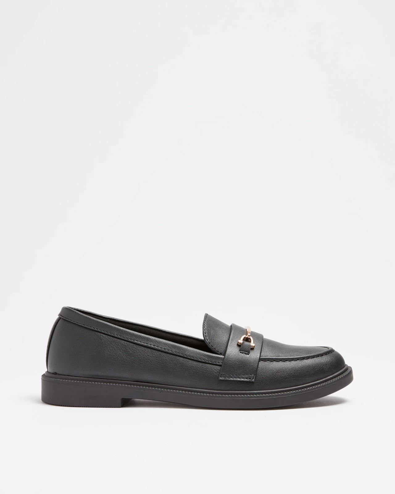 Take a fashionable step forward with the Womens Lina Low Loafer. This stylish shoe is crafted from a leather-look upper and features a microfibre lining for comfort. The design includes a synthetic sole unit, black colorway, stitched mocc round toe, penny strap with gold metal bit, folded and stitched topline and non-slip sole unit for added safety. It also features a padded footbed providing extra cushioning for all day wear. Make the Womens Lina Low Loafer part of any outfit this season for an on-trend look.