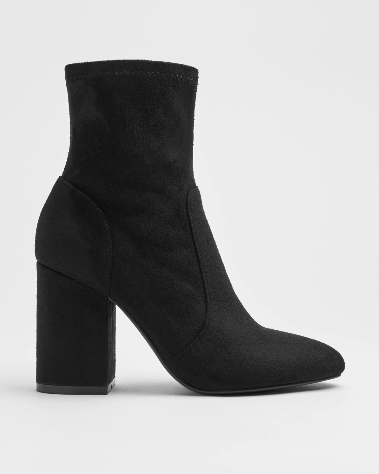 Introducing the Lorna Women's Micro Heeled Boot, a sleek and trend-setting choice for your footwear collection. Crafted from luxurious black micro suede-like material, these boots feature a closed almond toe and inner zip for easy wear. The 9cm self-wrapped block heel adds a touch of elegance, while the padded footbed ensures all-day comfort. Step out in style with these versatile boots, perfect for both casual and smart occasions. Elevate your look and treat yourself to the ultimate in sophisticated footwear.