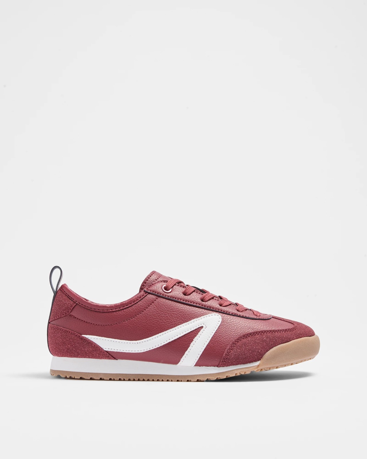 Step into style and comfort with our Womens Mini Wedge Sneaker - Mia. These trendy sneakers feature a synthetic upper and a classic closed round toe design, offering both resilience and charm. The 6-eyelet lacing provides a secure fit, while the padded wedge footbed offers superior comfort for all-day wear. Easy to slip on with a back pull tab, these sneakers are perfect for any casual outing. Enhance your footwear collection with Mia and experience the perfect blend of fashion and function. Make these sneakers yours today!