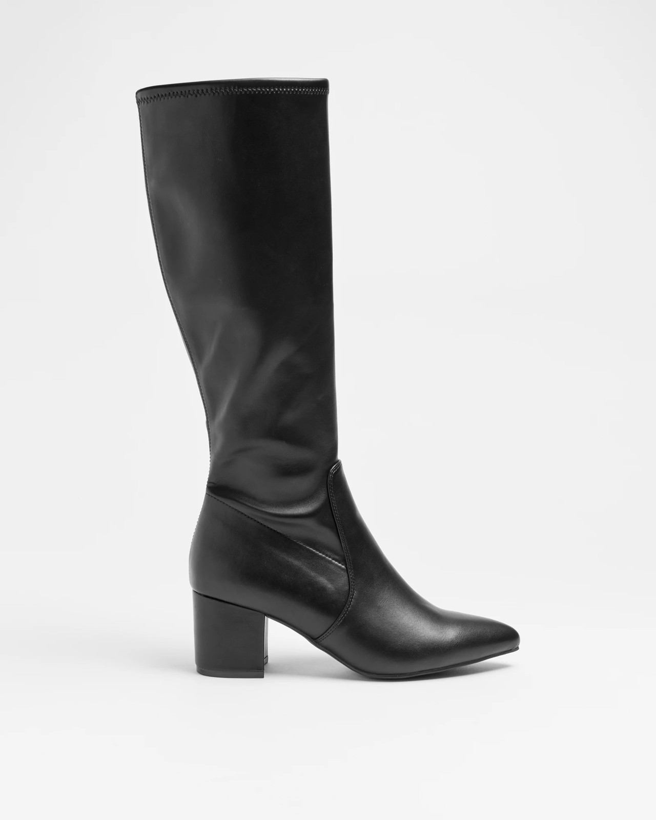 Step out in style with our Women's Lenny Pointed Long Boots. Made with a sleek synthetic leather-look upper, these black boots feature a closed pointed toe and a full inner zip for easy wear. The mesh lining and padded footbed provide all-day comfort, while the 6cm self-wrapped block heel adds a touch of elegance. Complete with a durable synthetic sole, these boots are perfect for any occasion, from casual outings to special events. Elevate your look with these stylish long boots.