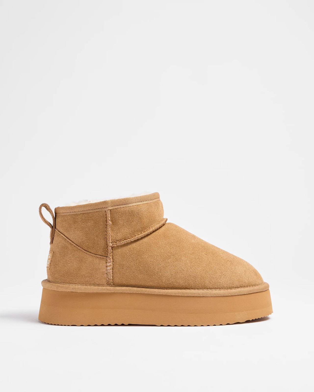 Step into unparalleled comfort and chic style with the Women's Sheepskin and Leather Platform Pixie Slipper Boot. These boots feature a soft sheepskin lining and a leather exterior that keeps your feet cosy and dry. The memory foam insole provides a cushioned walk, while the water-resistant outer ensures durability. Easily slip them on with the back pull tab and enjoy the added height from the 3cm platform sole. Your feet will thank you treat yourself to a pair now!