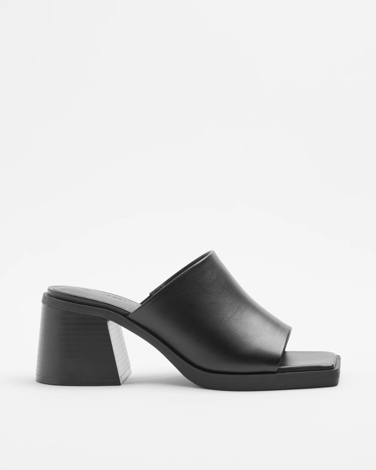 Introducing the Womens Tania Square Toe Mule Heel, the perfect addition to your shoe collection. Crafted with a leather-look synthetic upper, these heels are both stylish and comfortable. The square open toe and open back design add a touch of sophistication to any outfit. With a padded insole, your feet will stay comfortable all day long. The 6cm veneer stacked block heel elevates your style while providing just the right amount of height. Complete your look with these versatile heels that are suitable for any occasion. Upgrade your wardrobe today!