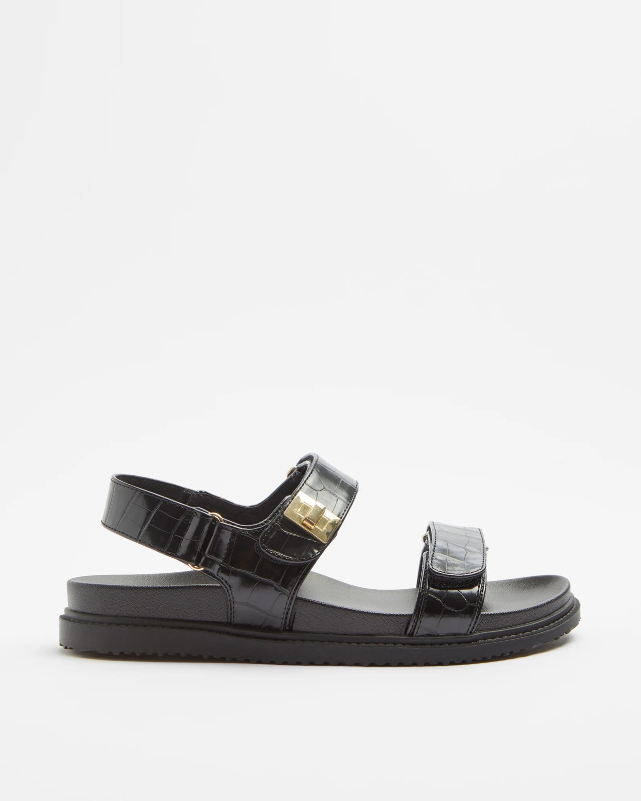 Step into style and comfort with our Women's Turn Buckle Sandal. The sandal features a luxurious leather-look synthetic croc print upper, enhancing both elegance and durability. The open toe design allows your feet to breathe, while the two self-fastening upper straps with gold turn buckle detail add a touch of sophistication. The moulded footbed provides support for all-day wear, and the synthetic sole delivers reliable traction. Whether you’re strolling through the city or enjoying a leisurely walk, these sandals are the perfect blend of fashion and functionality.