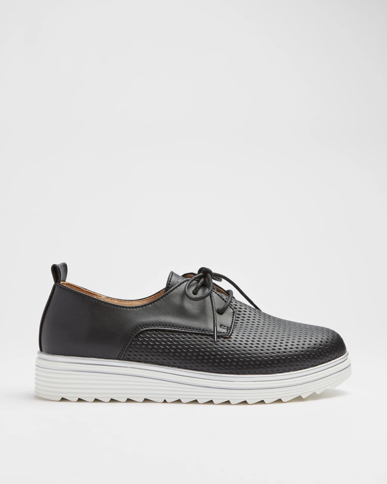 Step into comfort and style with our Women's Wide Fit Fiji Comfort Lace Up Flat Made with a synthetic textured leather-look upper, these flats provide a trendy and fashionable look. The wide fit ensures a comfortable and breathable experience for your feet. With a closed round toe and 2-hole lace-up design, these flats offer a secure and adjustable fit. The back pull tab allows for easy slip-on and off. Enjoy the added comfort of the padded footbed and the 3cm wedge heel for a subtle elevation. The cleated sole provides excellent traction and durability. Upgrade your casual look today and experience the perfect combination of style and comfort.